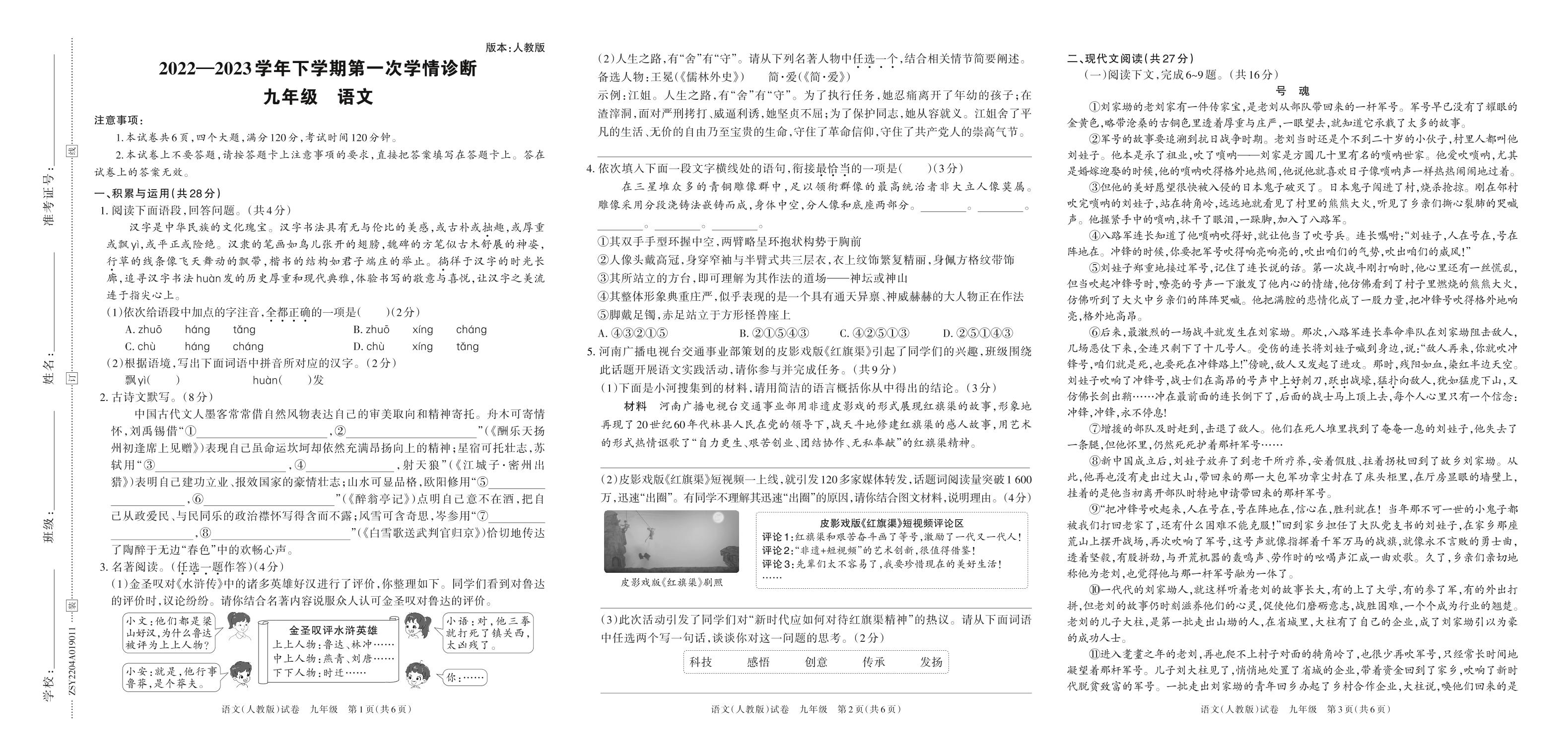 河南省洛阳市宜阳县2022—2023学年下学期第一次学情诊断试卷九年级语文(人教版)