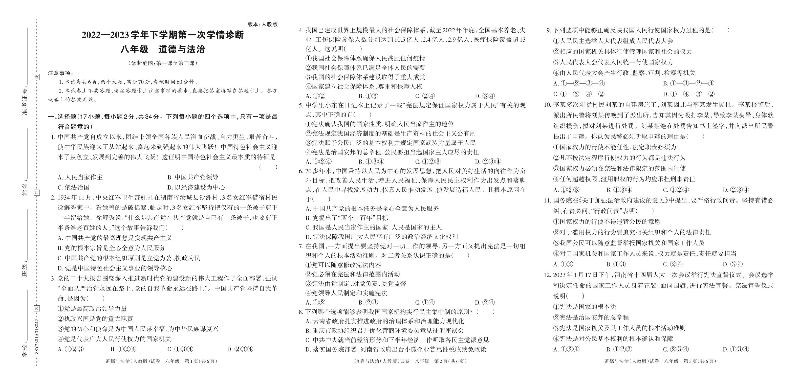 河南省洛阳市宜阳县2022—2023学年下学期第一次学情诊断试卷八年级道德与法治(人教版)