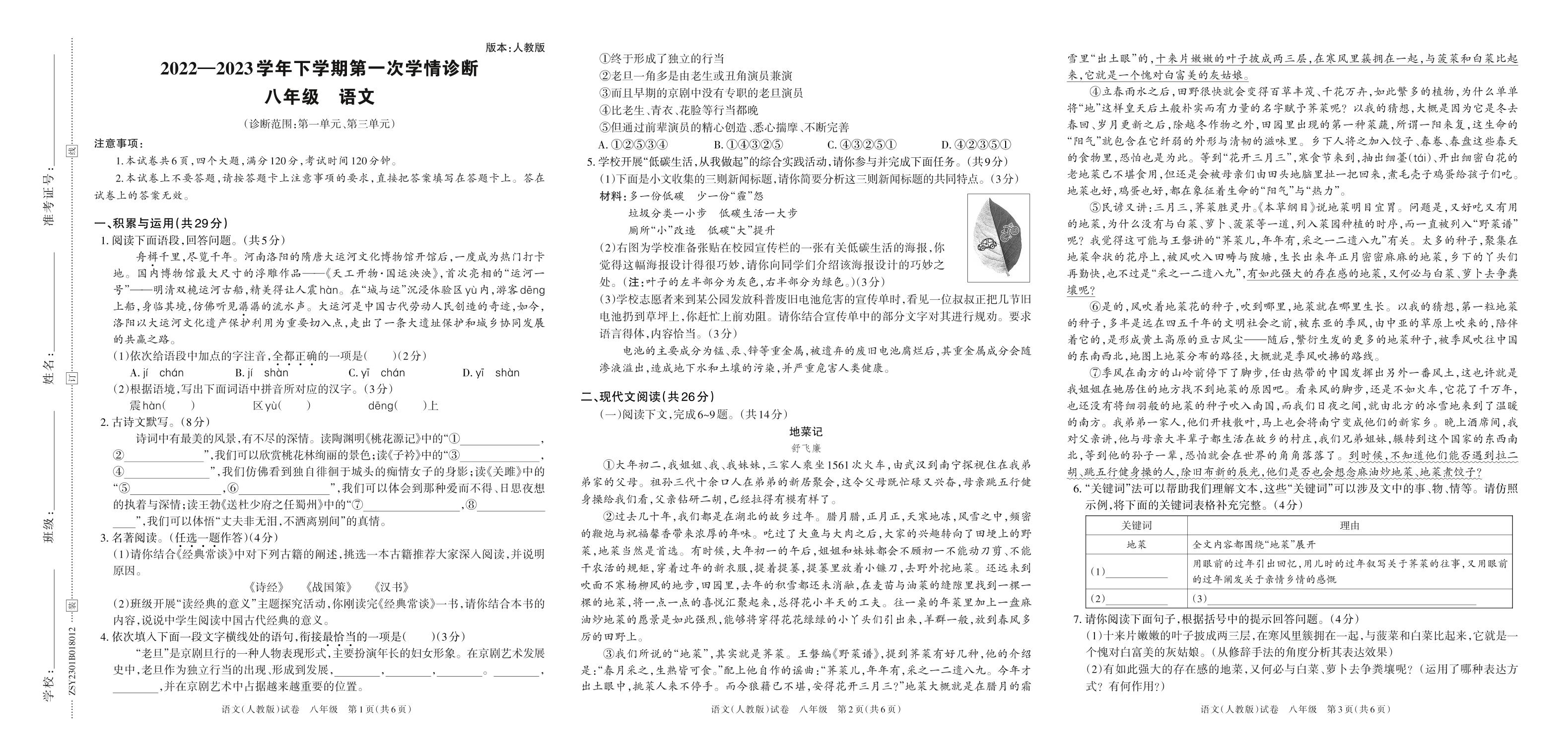 河南省洛阳市孟津区县直中学2022—2023学年下学期第一次学情诊断试卷八年级语文(人教版)
