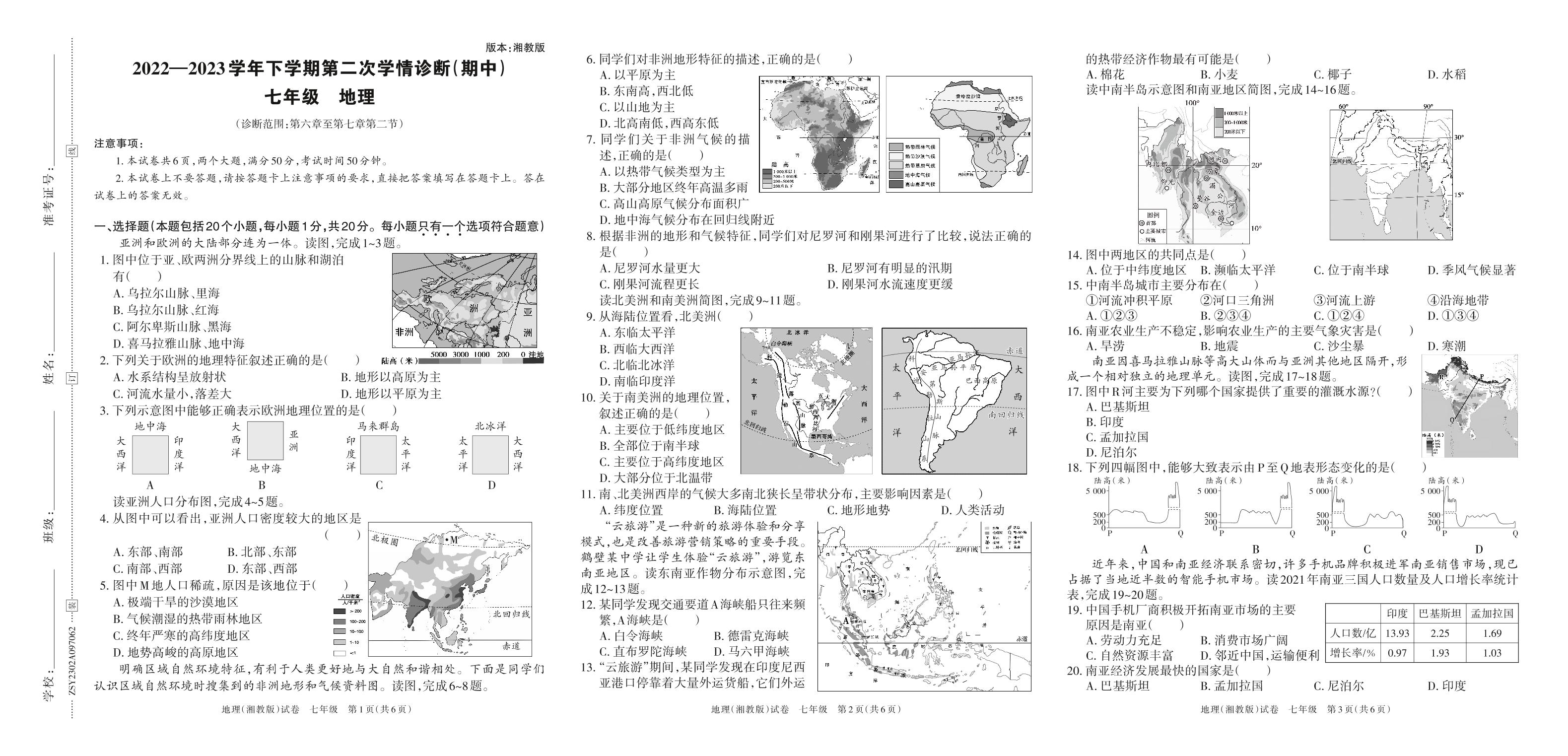 河南省鹤壁市淇滨中学2022—2023学年下学期第二次学情诊断(期中)试卷七年级地理(湘教版)