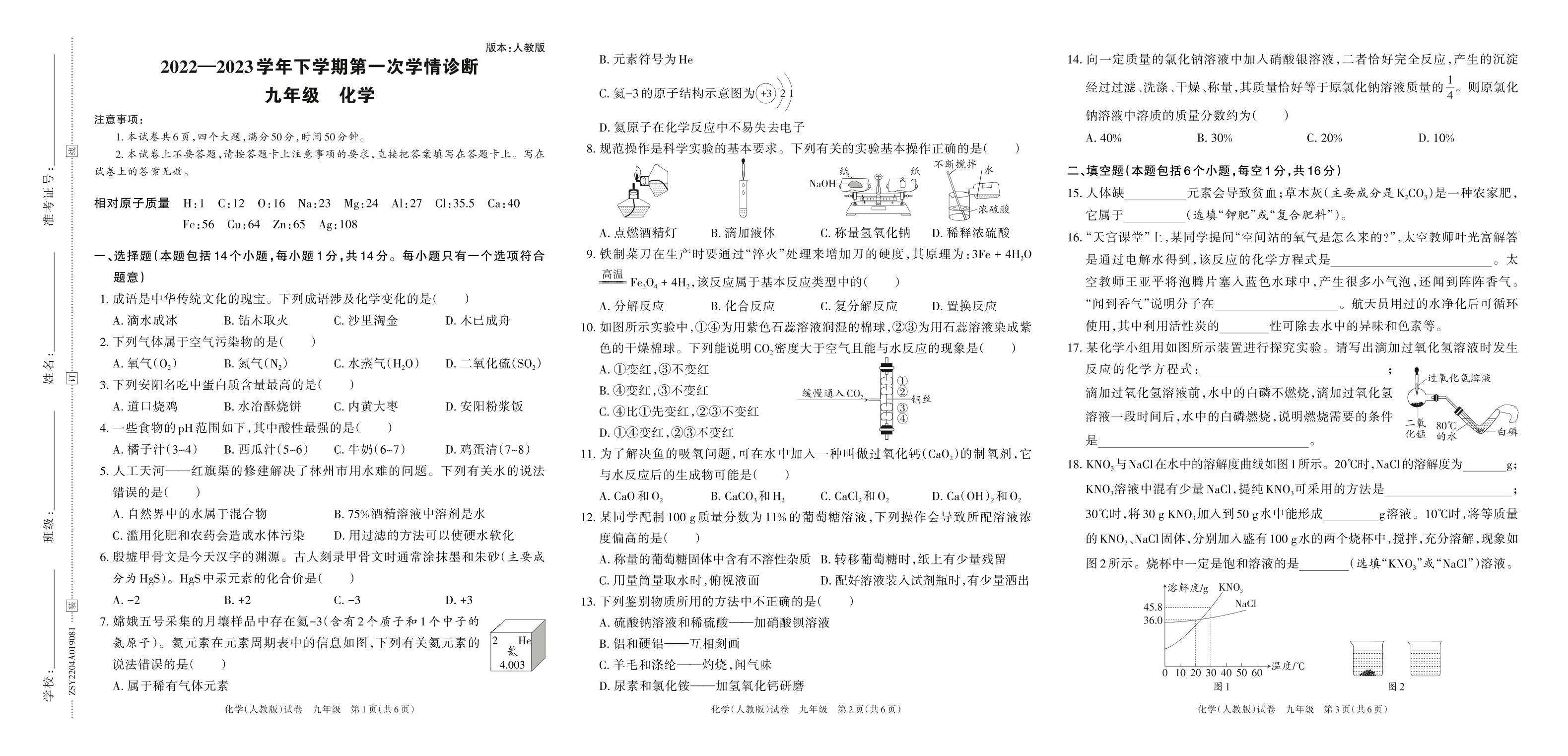 河南省洛阳市宜阳县2022—2023学年下学期第一次学情诊断试卷九年级化学(人教版)