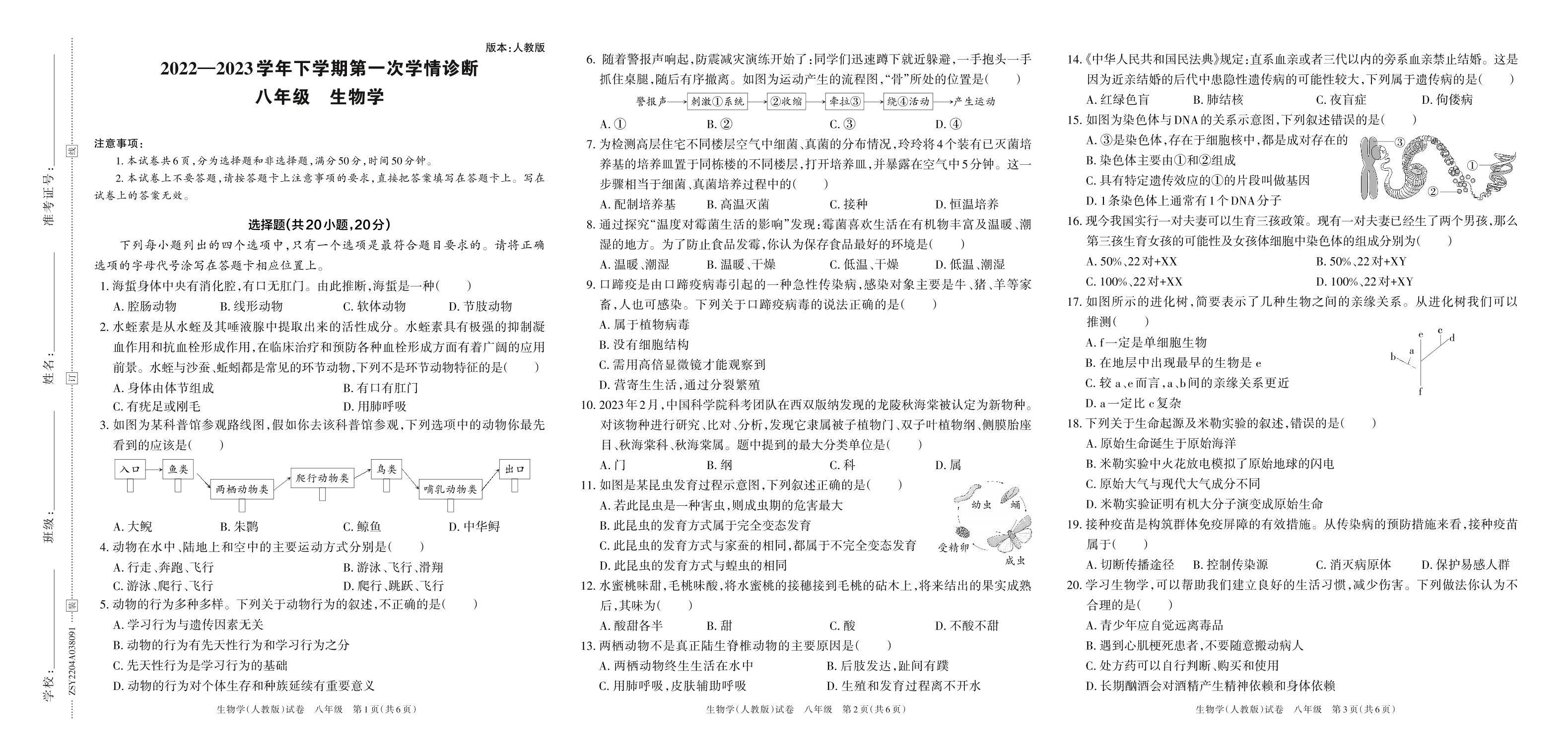 河南省巩义市三彩实验学校2022—2023学年下学期第一次学情诊断试卷八年级生物(人教版)