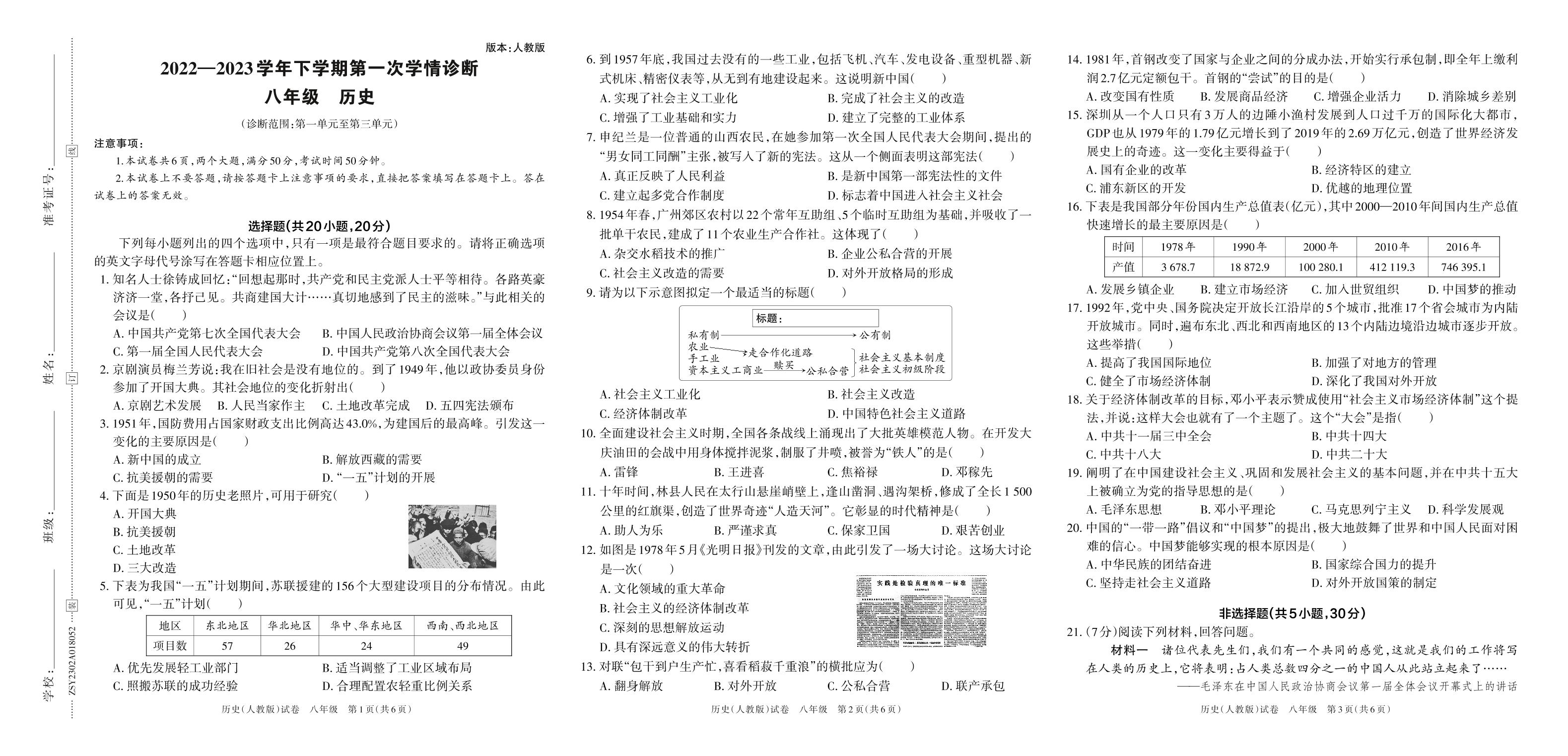 河南省洛阳市孟津区县直中学2022—2023学年下学期第一次学情诊断试卷八年级历史(人教版)