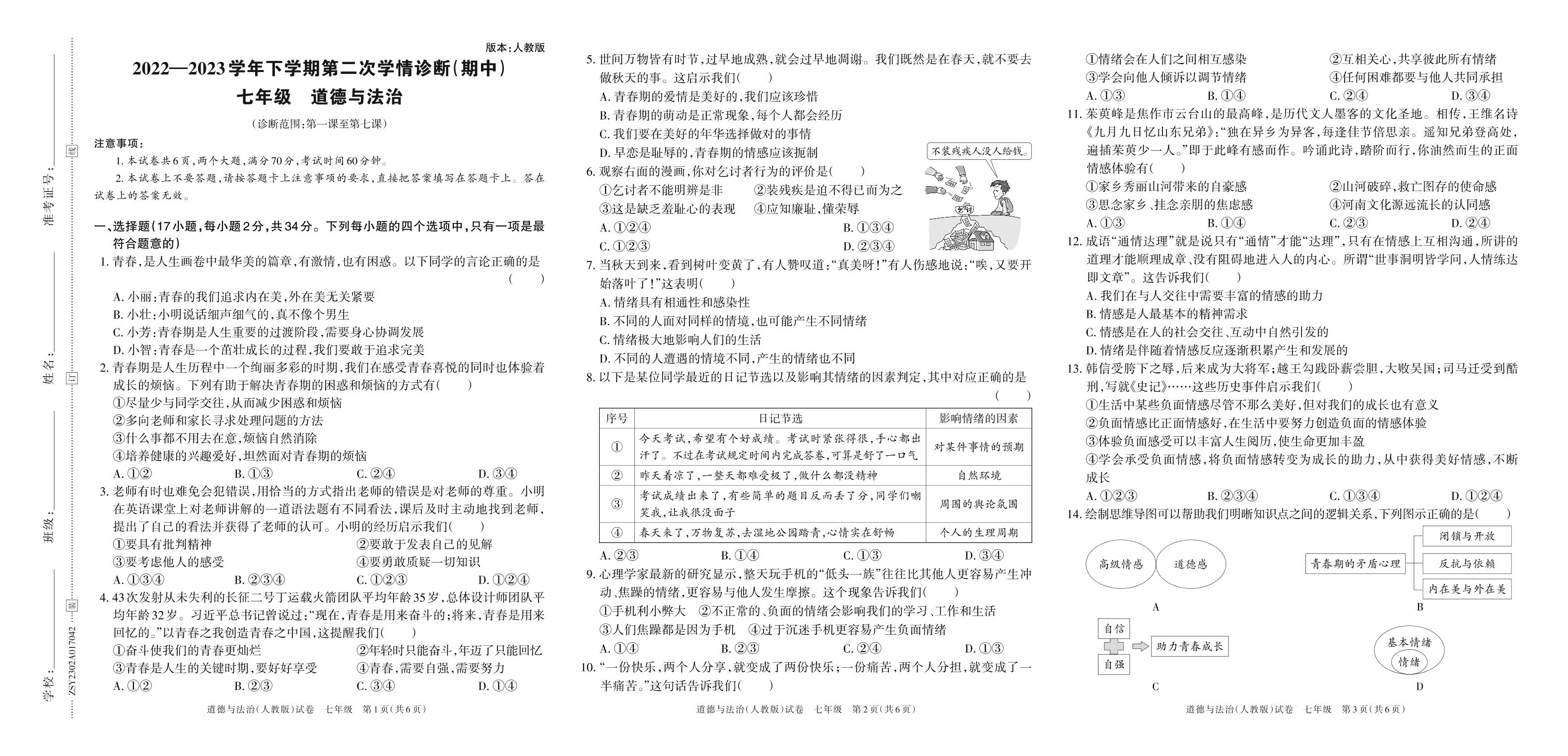 河南省鹤壁市淇滨中学2022—2023学年下学期第二次学情诊断(期中)试卷七年级道德与法治(人教版)