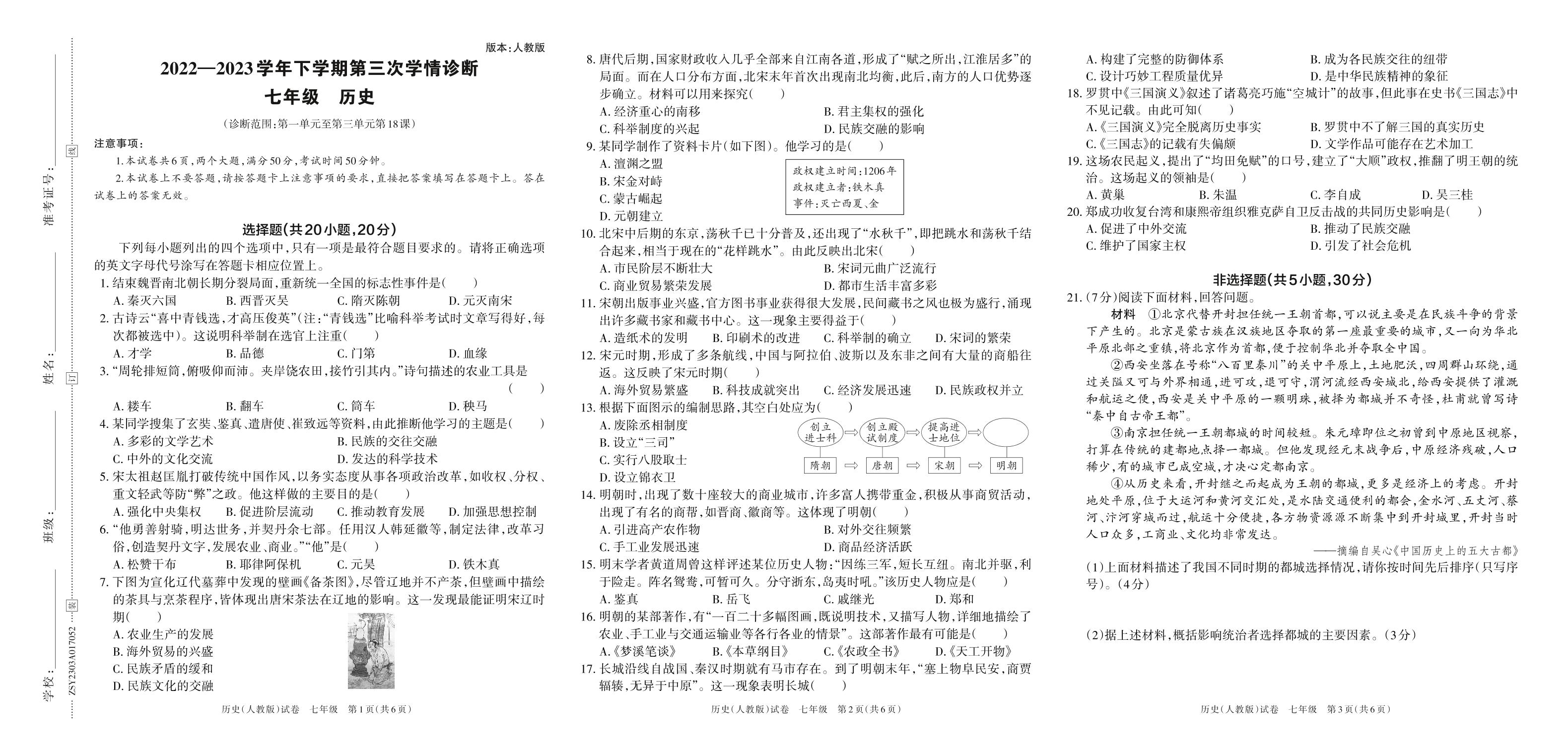 河南省洛阳市宜阳县2022—2023学年下学期第三次学情诊断试卷七年级历史(人教版)