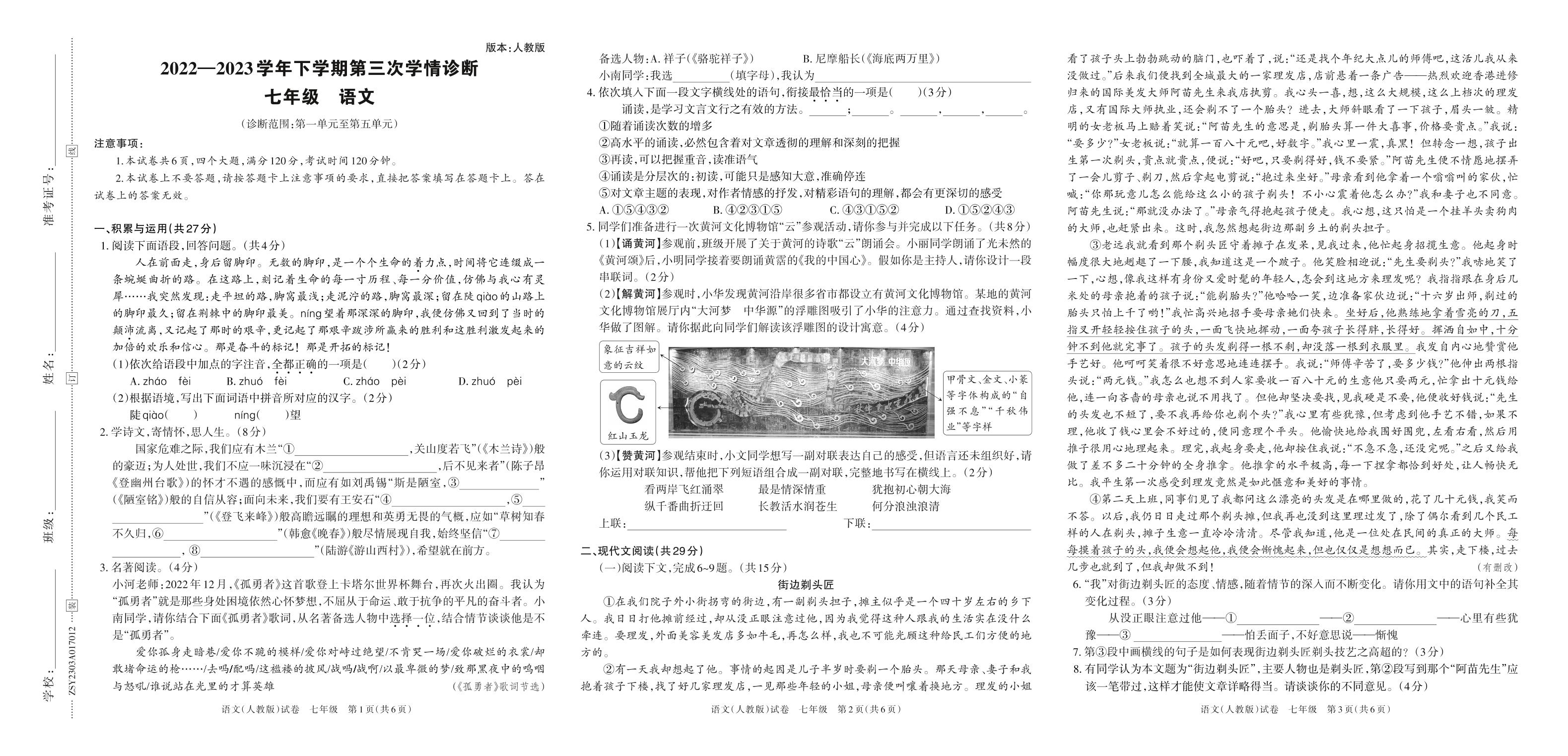 河南省洛阳市宜阳县2022—2023学年下学期第三次学情诊断试卷七年级语文(人教版)