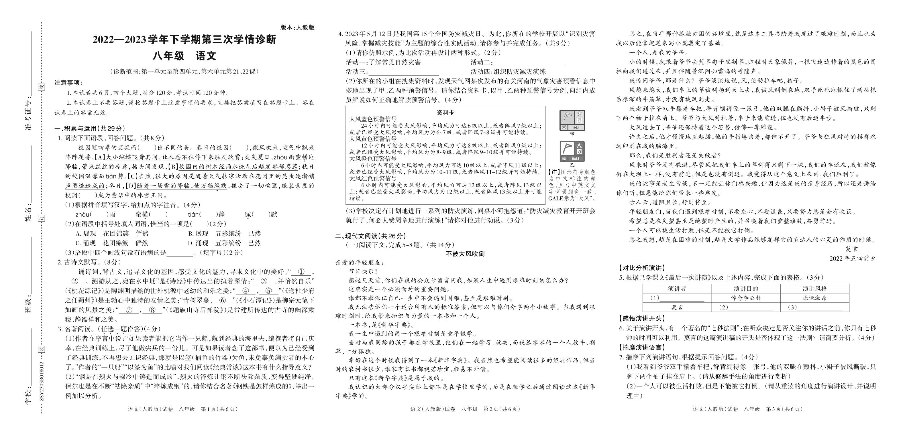 河南省洛阳市宜阳县2022—2023学年下学期第三次学情诊断试卷八年级语文(人教版)