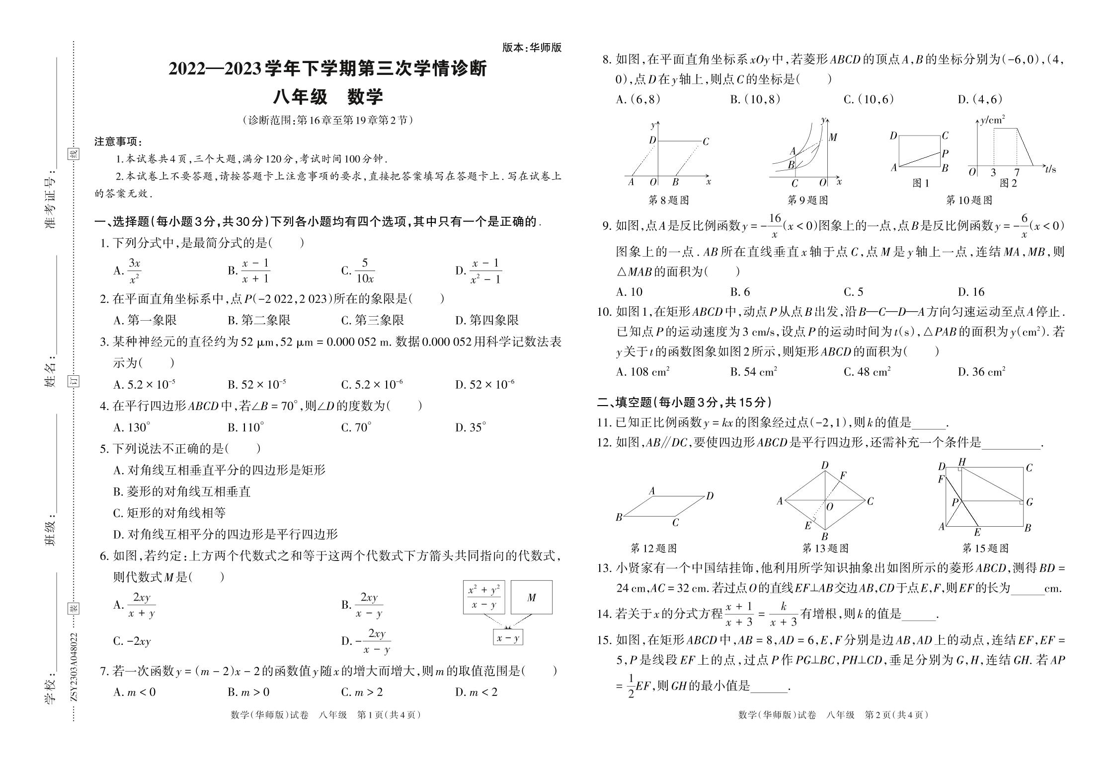 河南省洛阳市宜阳县2022—2023学年下学期第三次学情诊断试卷八年级数学(华师版)