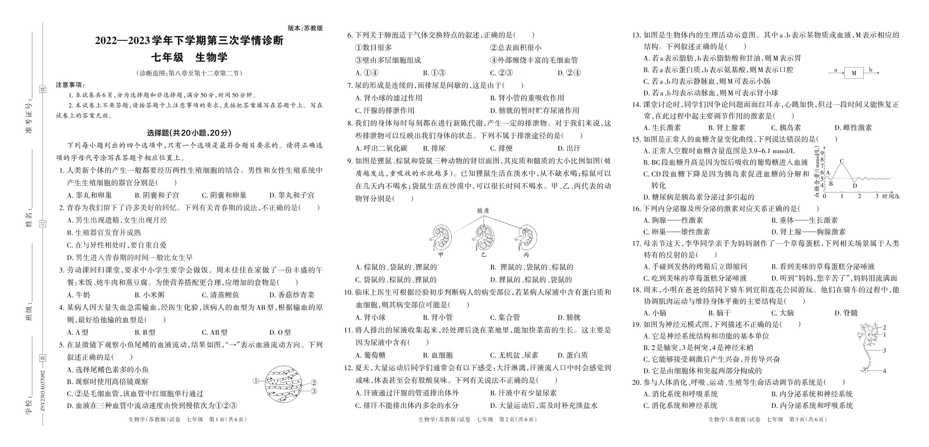河南省洛阳市宜阳县2022—2023学年下学期第三次学情诊断试卷七年级生物(苏教版)