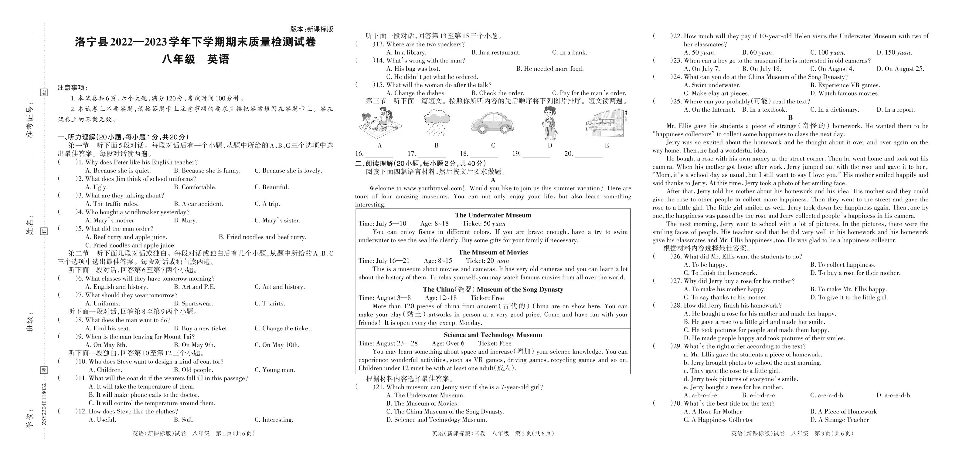 河南省洛阳市洛宁县2022—2023学年下学期期末质量检测试卷八年级英语(新课标版)