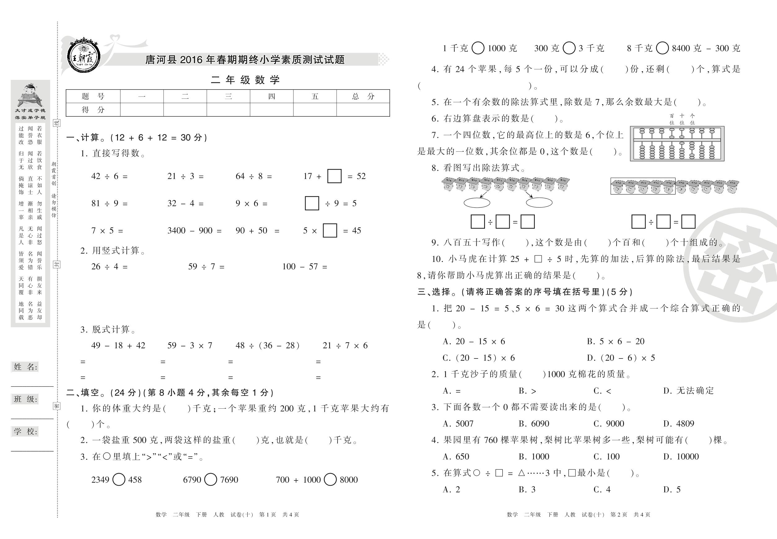 2015-2016学年第二学期南阳市唐河县二年级数学试卷(人教版)【10】