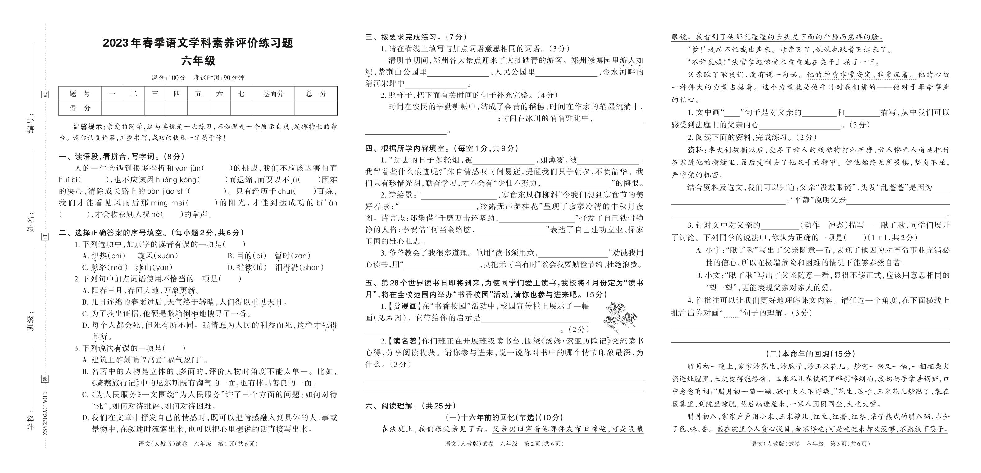 河南省新乡市获嘉县2023年春季语文学科素养评价练习题六年级(人教版)