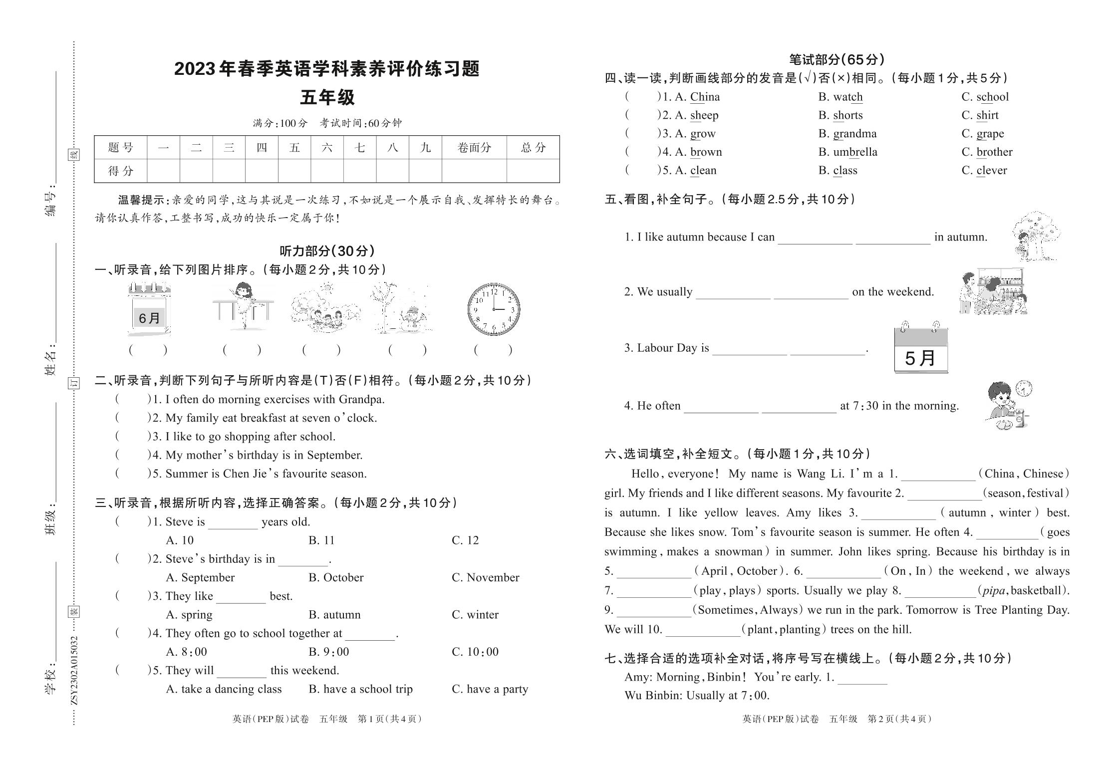 河南省新乡市获嘉县2023年春季英语学科素养评价练习题五年级(PEP版)