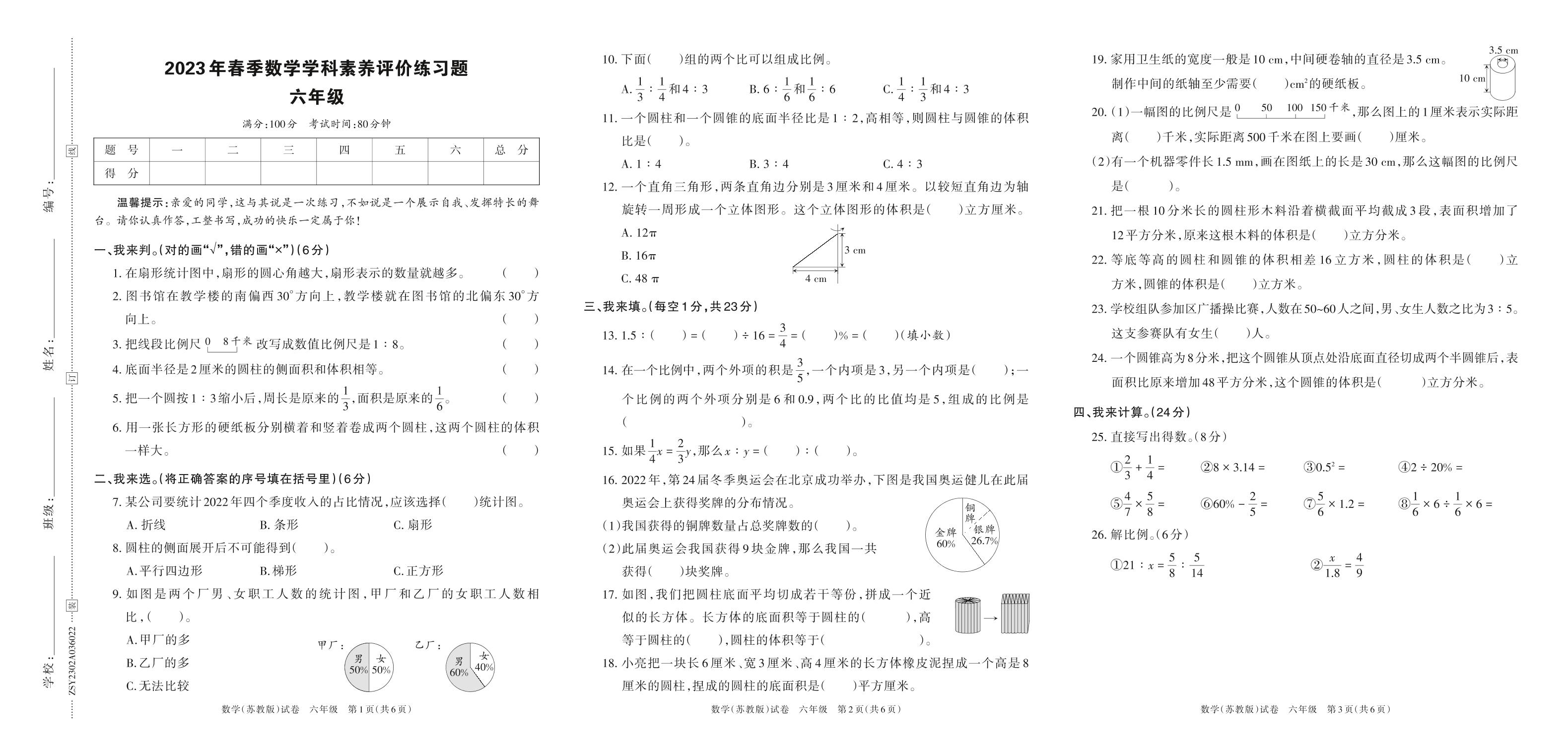 河南省新乡市获嘉县2023年春季数学学科素养评价练习题六年级(苏教版)