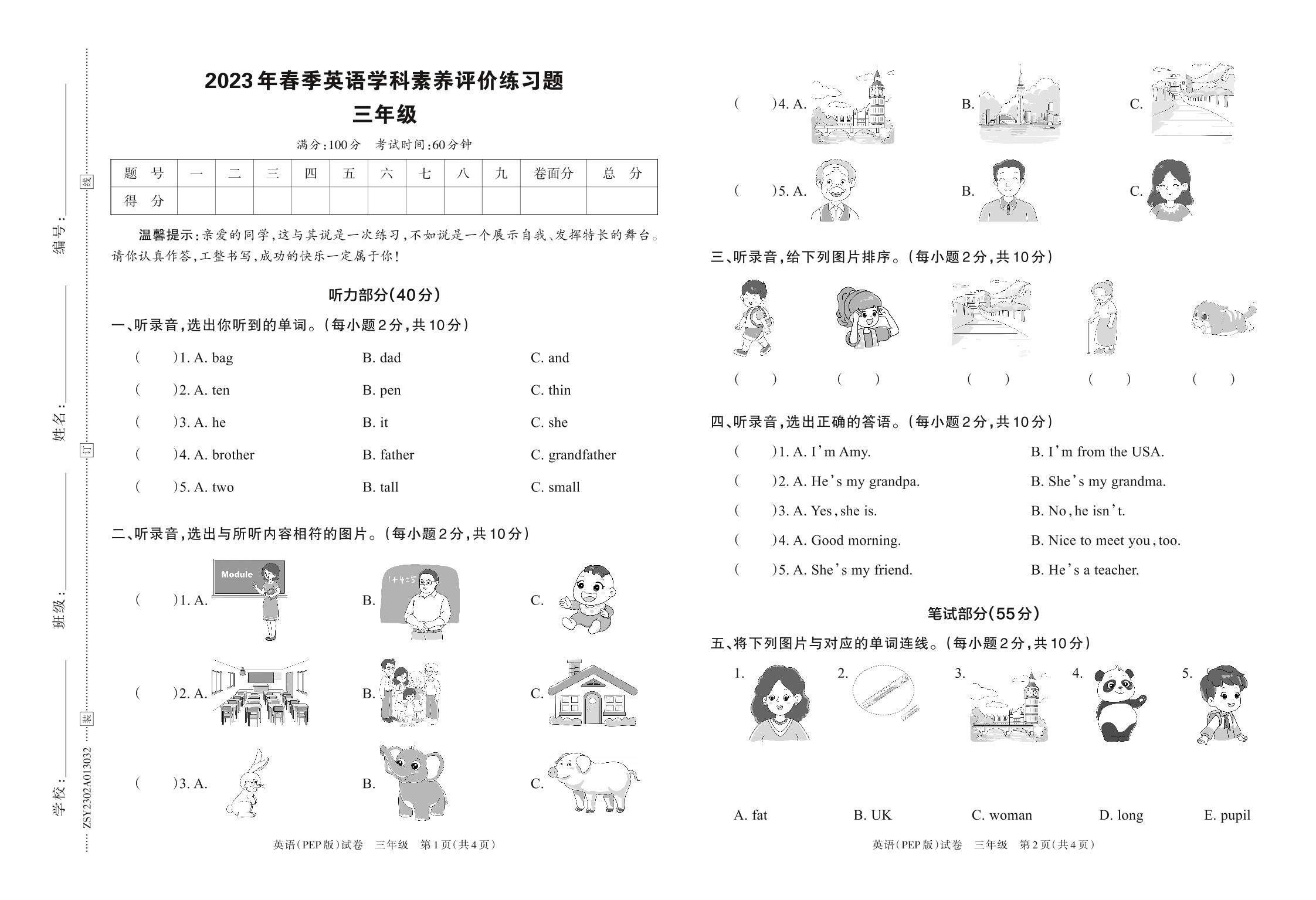 三年级英语人教PEP版(三起始)下册期中卷
