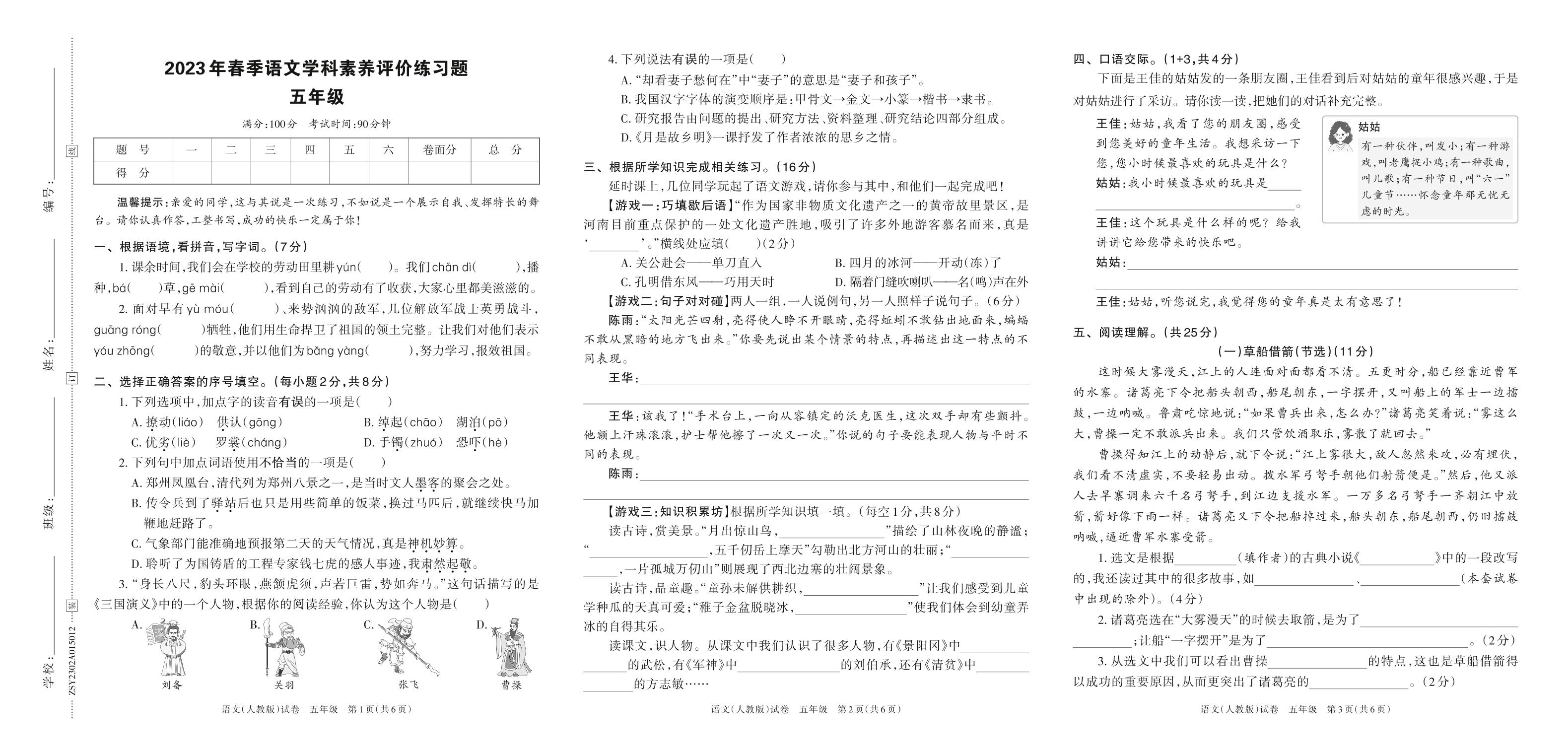 河南省平顶山市鲁山县2023年春季语文学科素养评价练习题五年级(人教版)