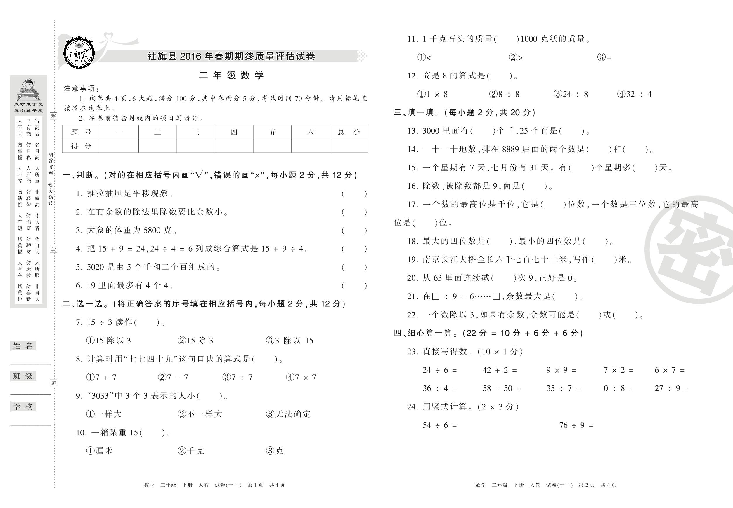 2015-2016学年第二学期南阳市社旗县二年级数学试卷(人教版)【11】