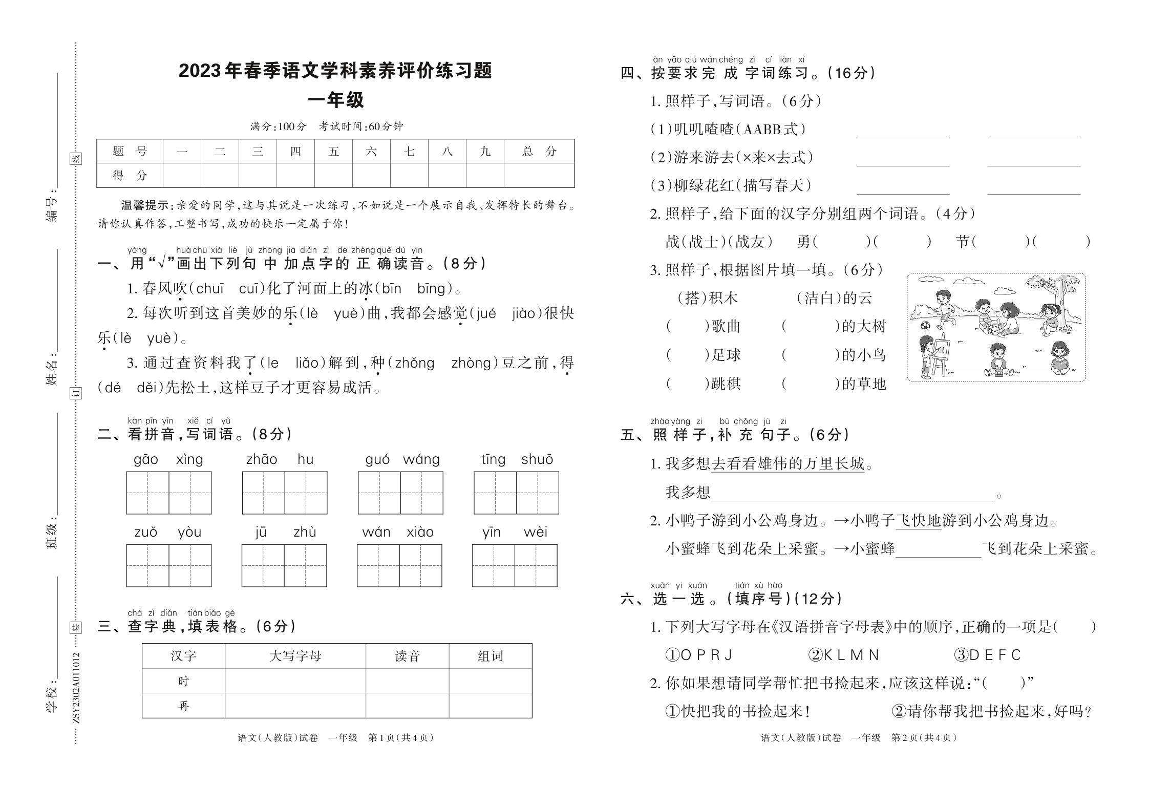 河南省平顶山市鲁山县2023年春季语文学科素养评价练习题一年级(人教版)