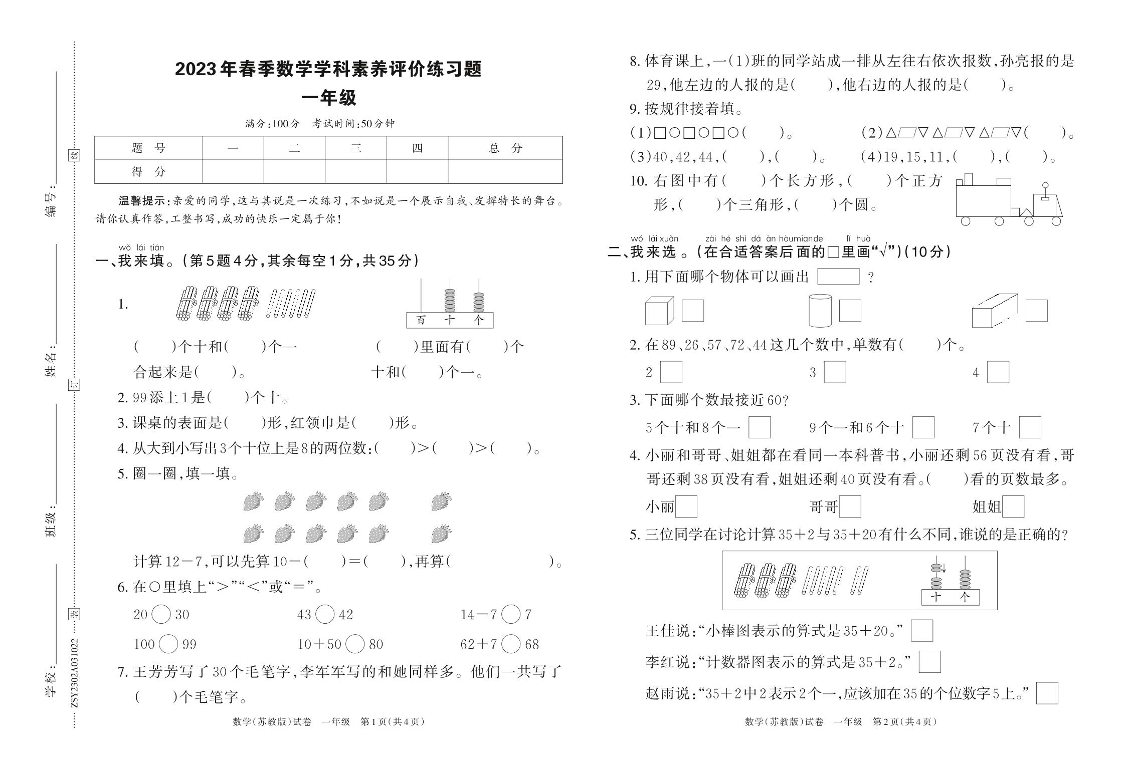 河南省平顶山市鲁山县2023年春季数学学科素养评价练习题一年级(苏教版)