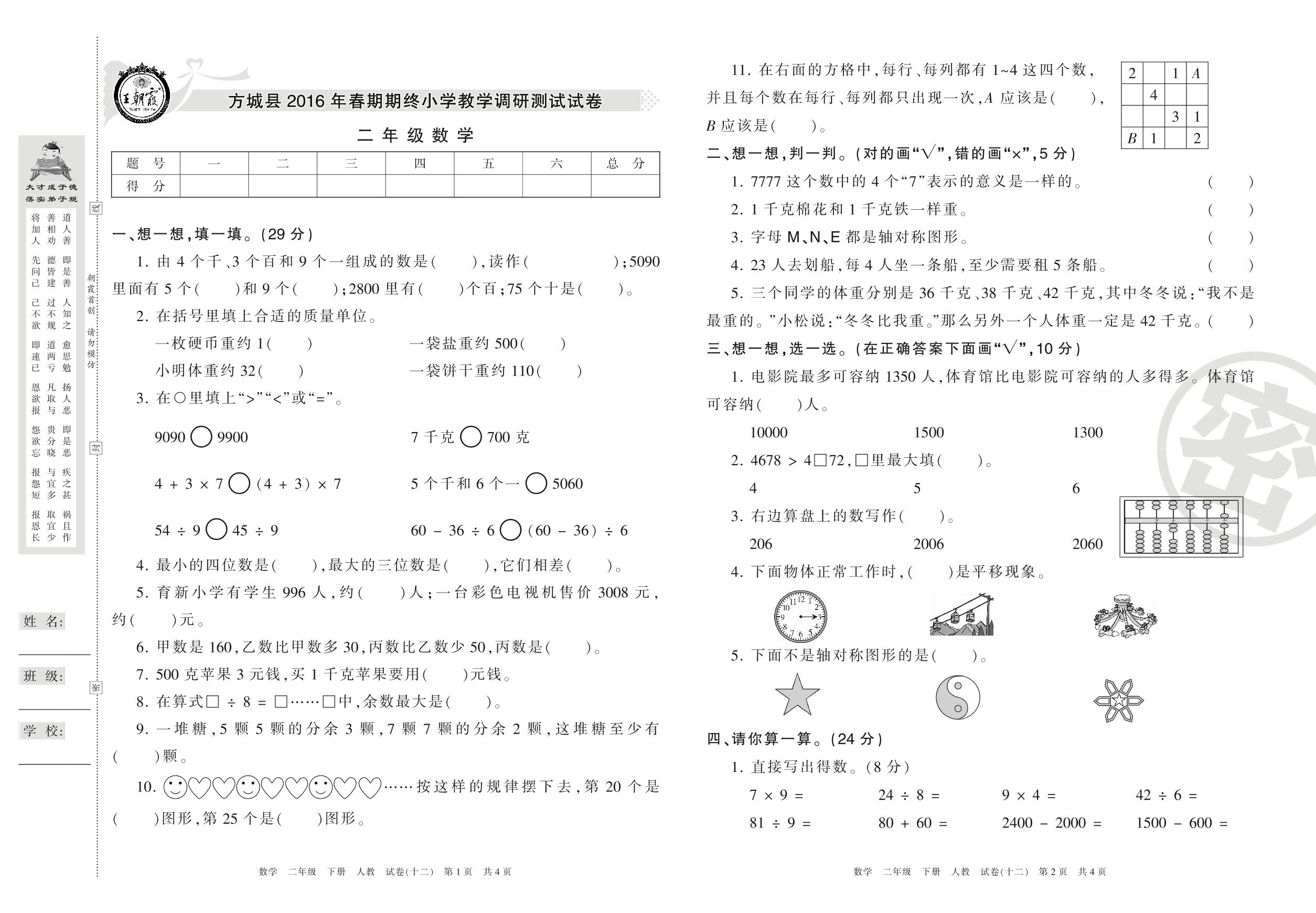 2015-2016学年第二学期南阳市方城县二年级数学试卷(人教版)【12】