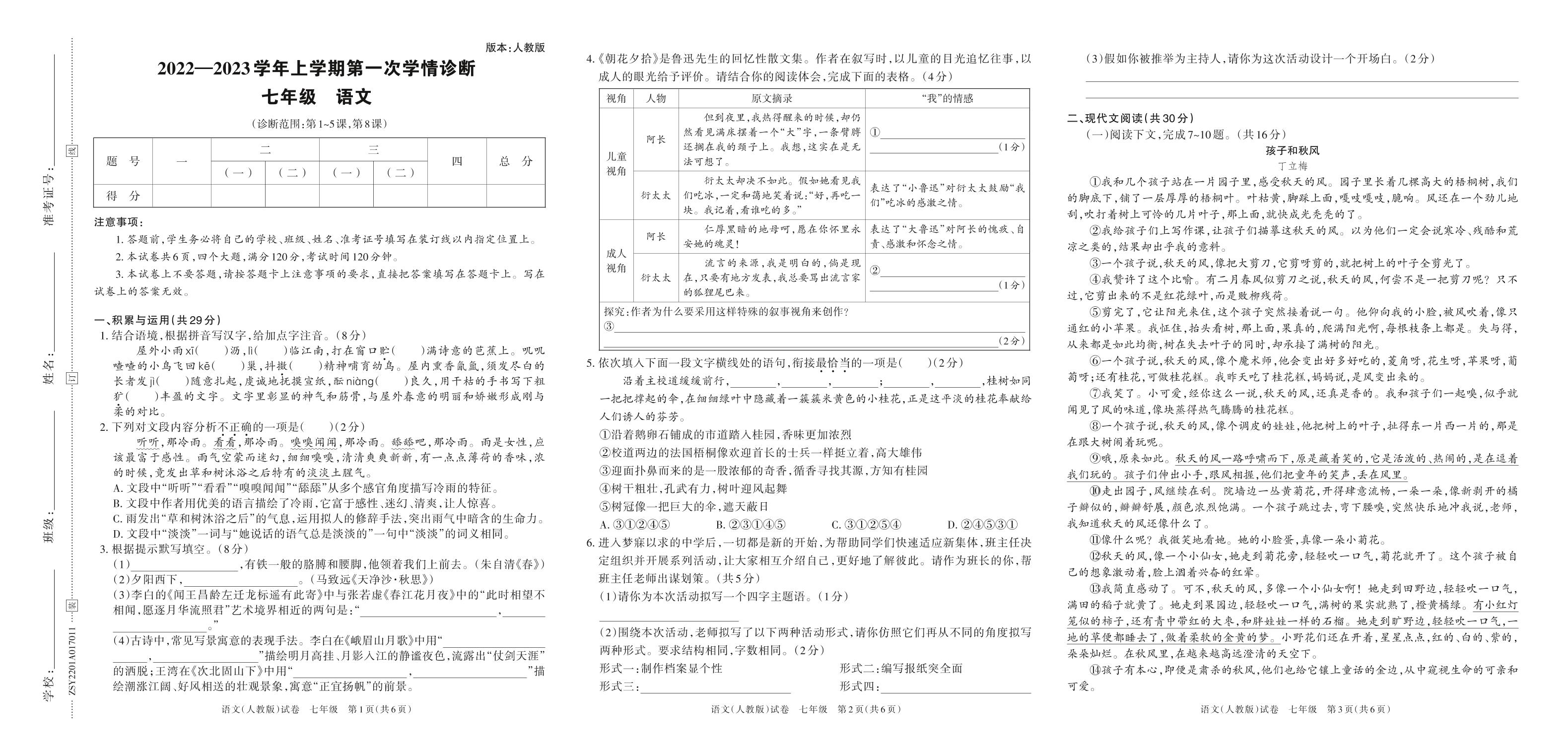 河南省洛阳市孟津区白鹤镇初级中学2022-2023学年上学期第一次学情诊断卷七年级语文(人教版)
