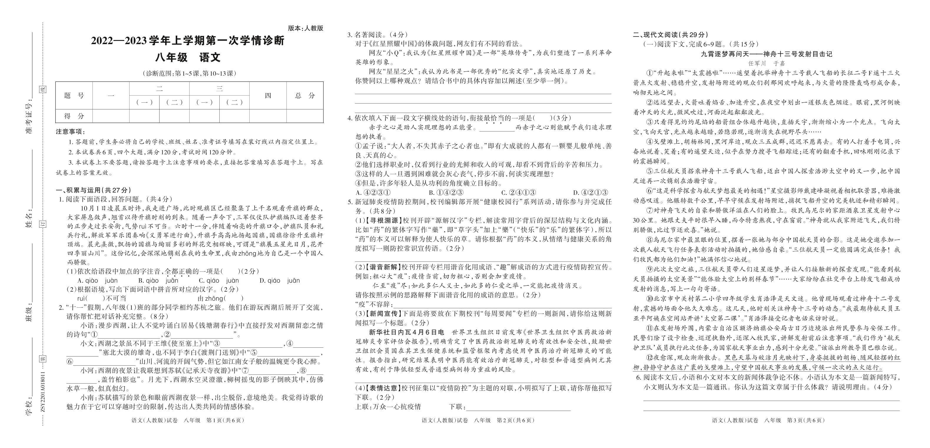 河南省洛阳市孟津区白鹤镇初级中学2022-2023学年上学期第一次学情诊断卷八年级语文(人教版)