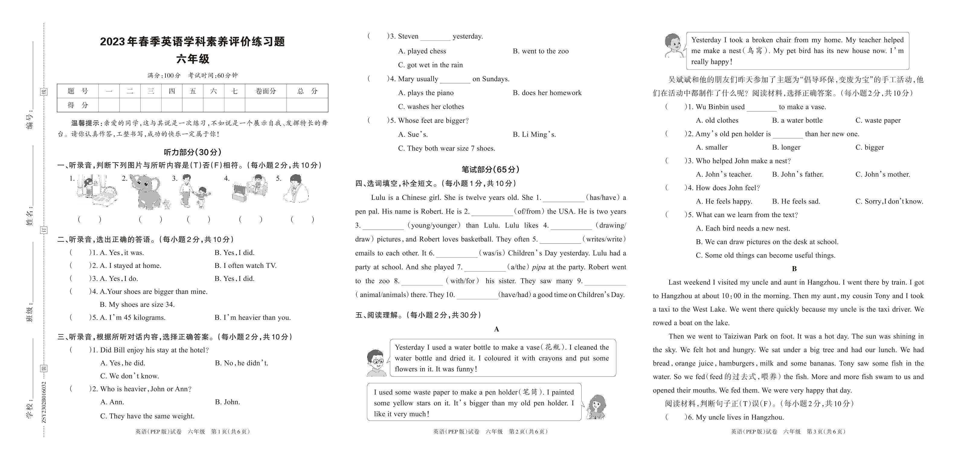 河南省郑州市中牟县2023年春季英语学科素养评价练习题六年级(PEP版)