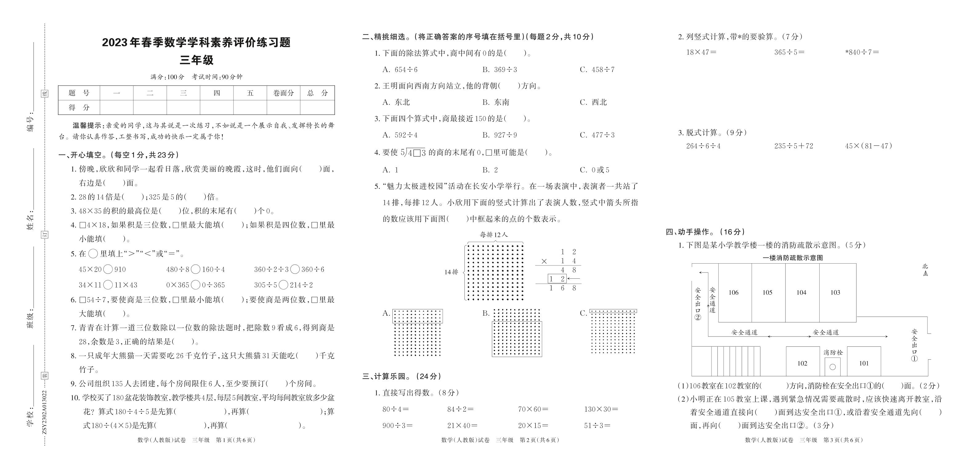 河南省郑州市中牟县2023年春季数学学科素养评价练习题三年级(人教版)