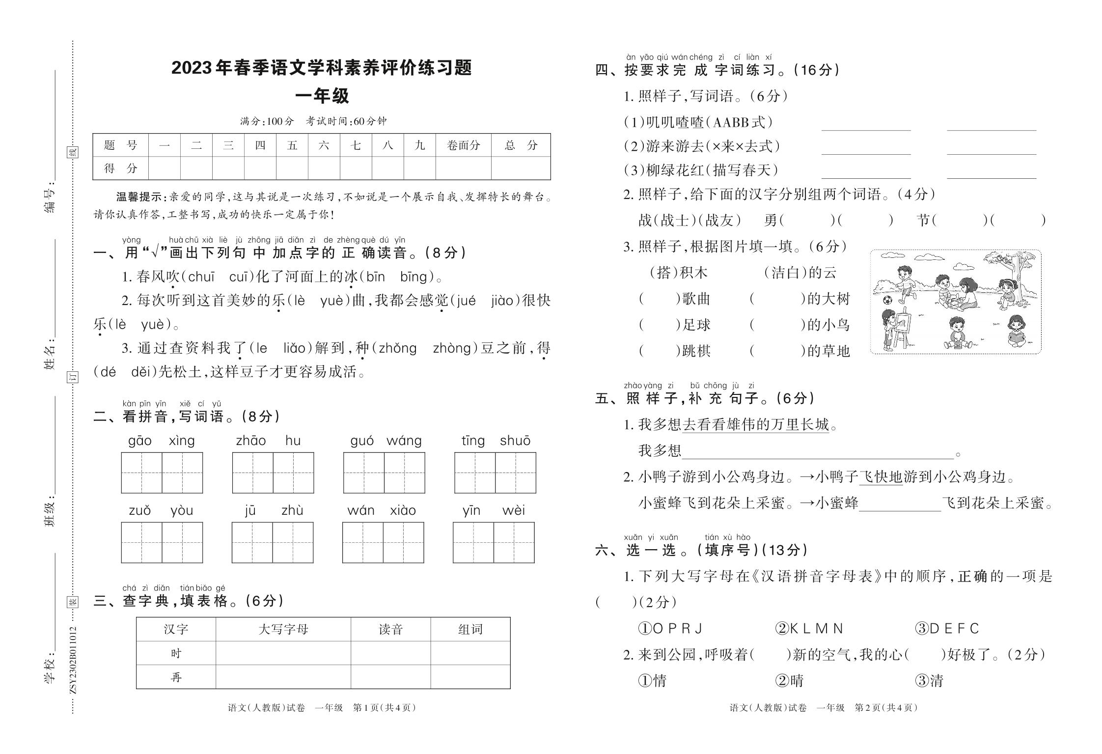 河南省郑州市中牟县2023年春季语文学科素养评价练习题一年级(人教版)