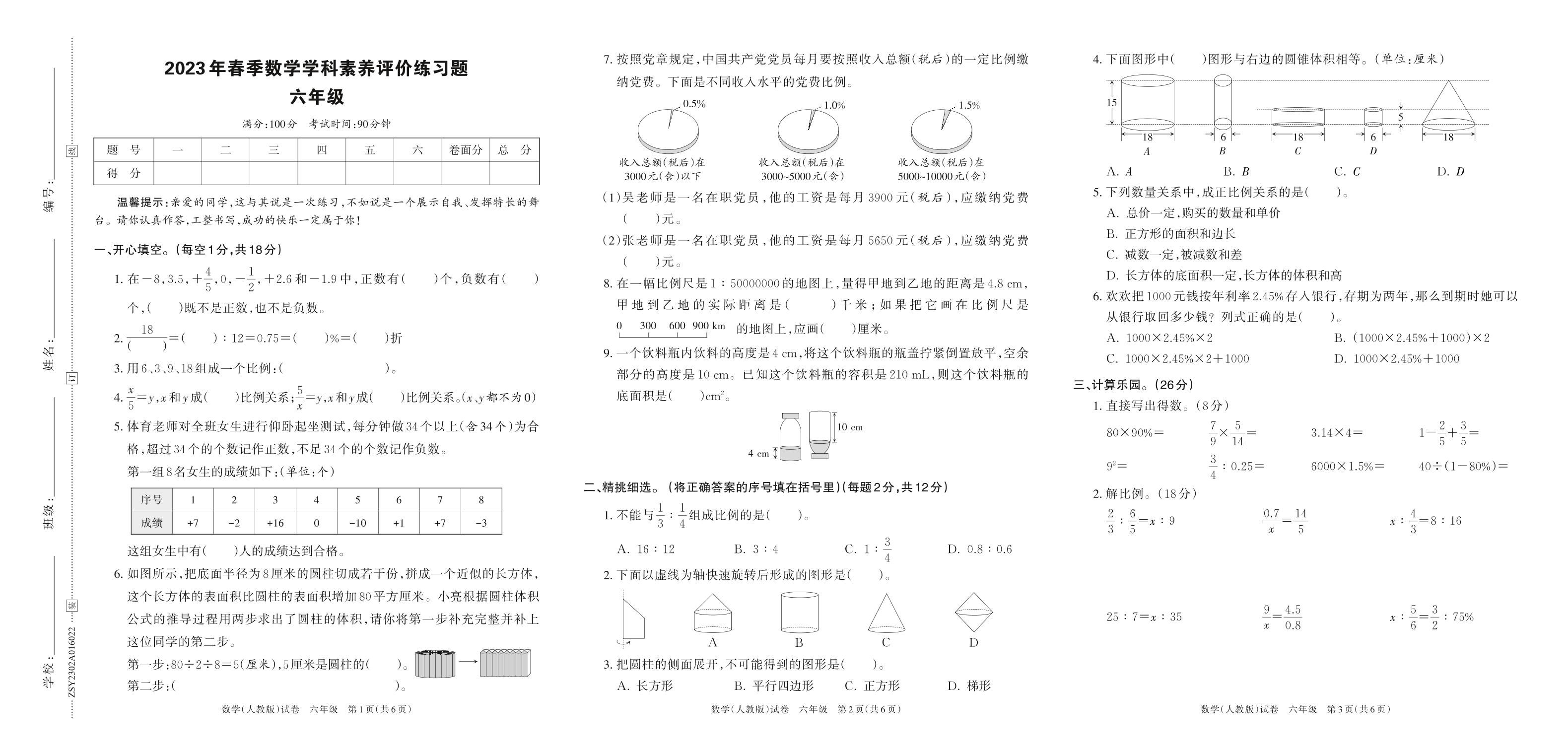 河南省郑州市中牟县2023年春季数学学科素养评价练习题六年级(人教版)