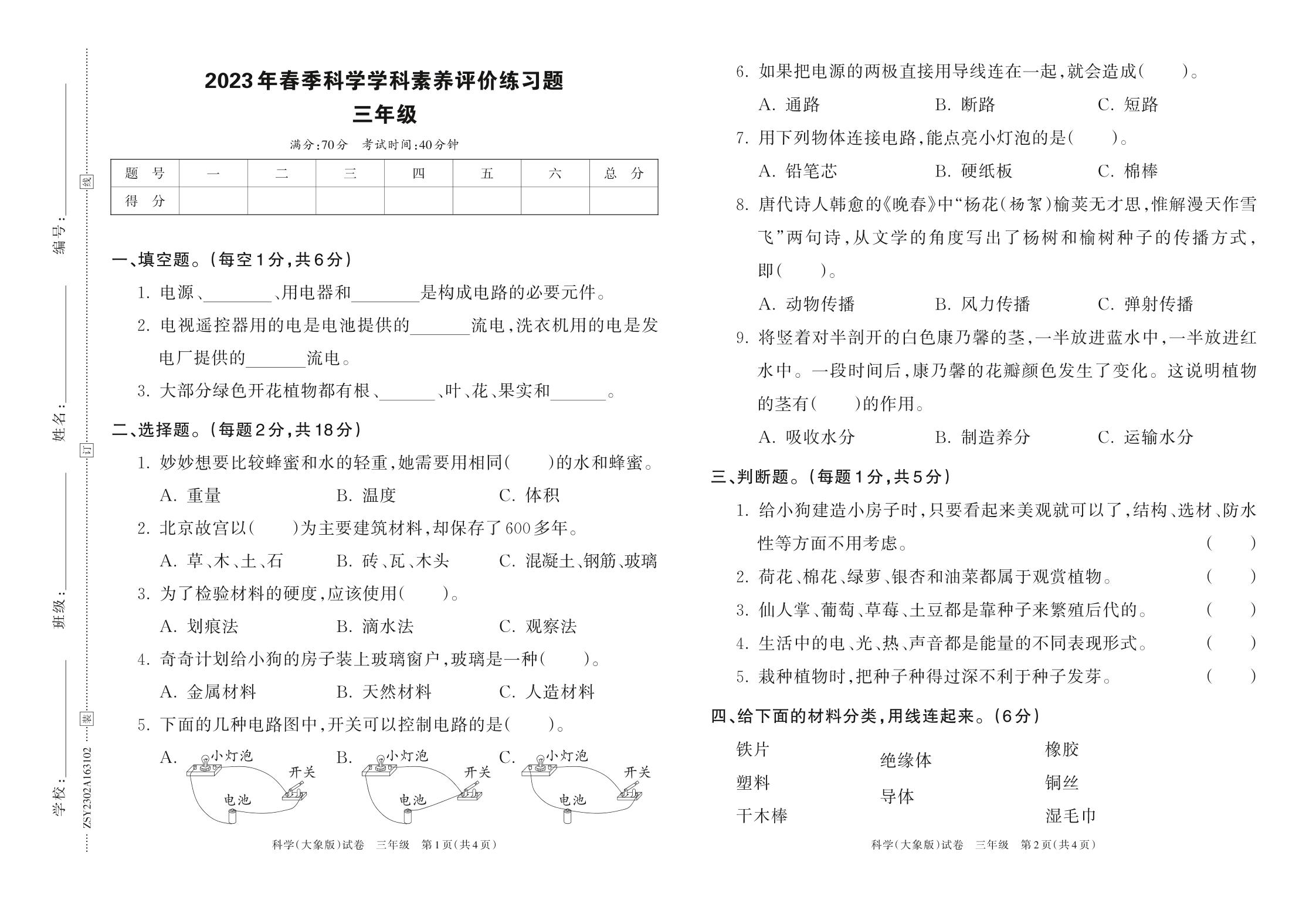 河南省洛阳市嵩县2023年春季科学学科素养评价练习题三年级(大象版)