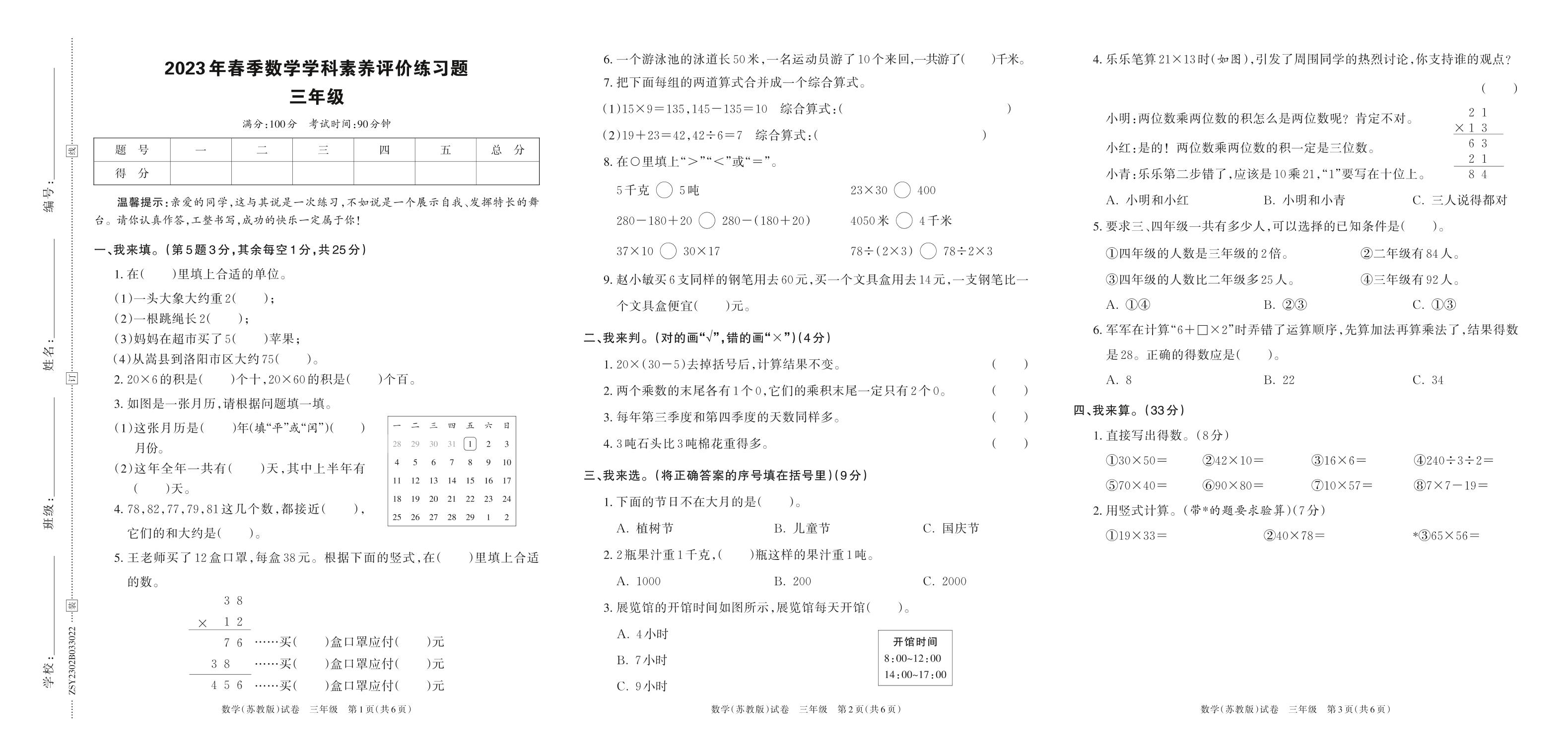 河南省洛阳市嵩县2023年春季数学学科素养评价练习题三年级(苏教版)