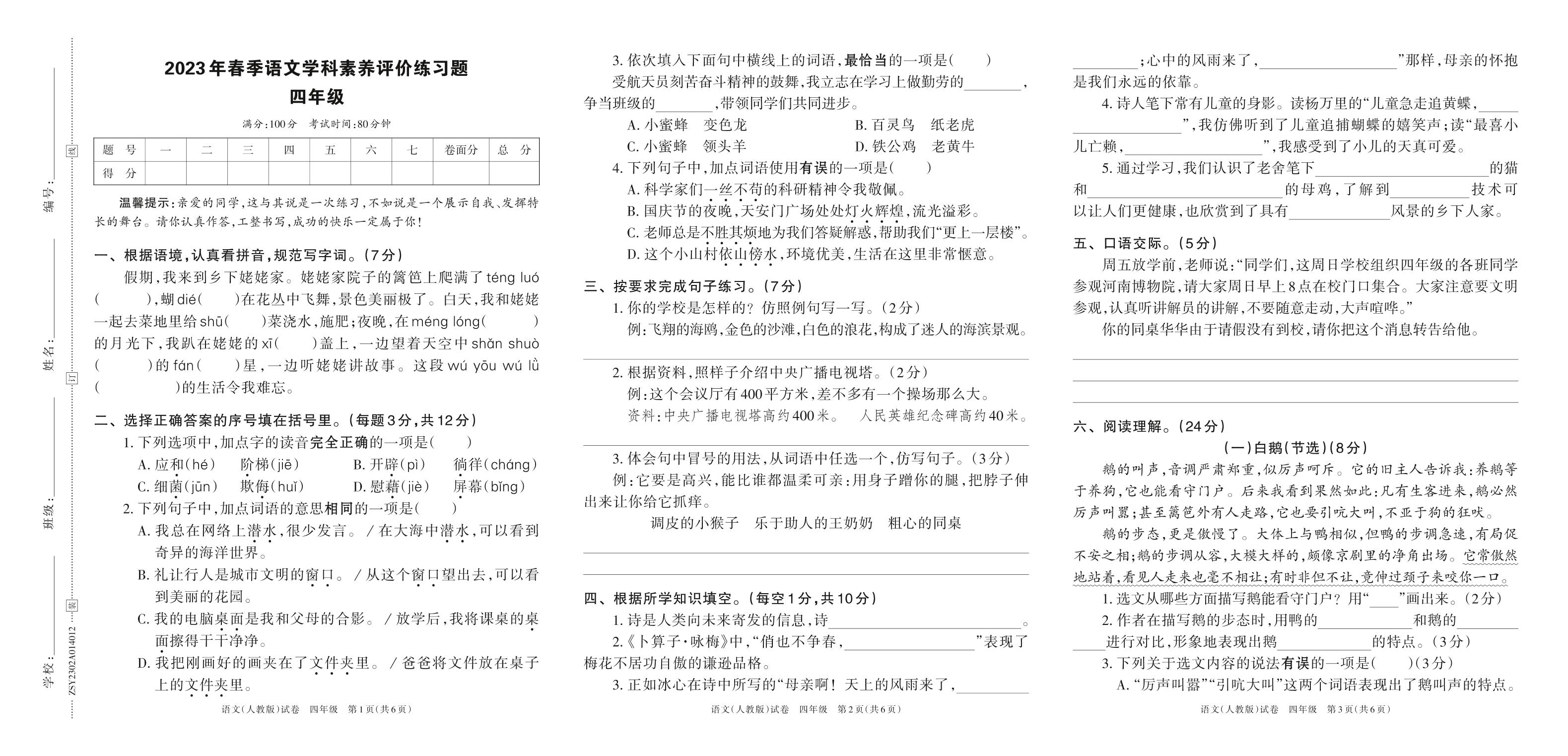 河南省洛阳市嵩县2023年春季语文学科素养评价练习题四年级(人教版)