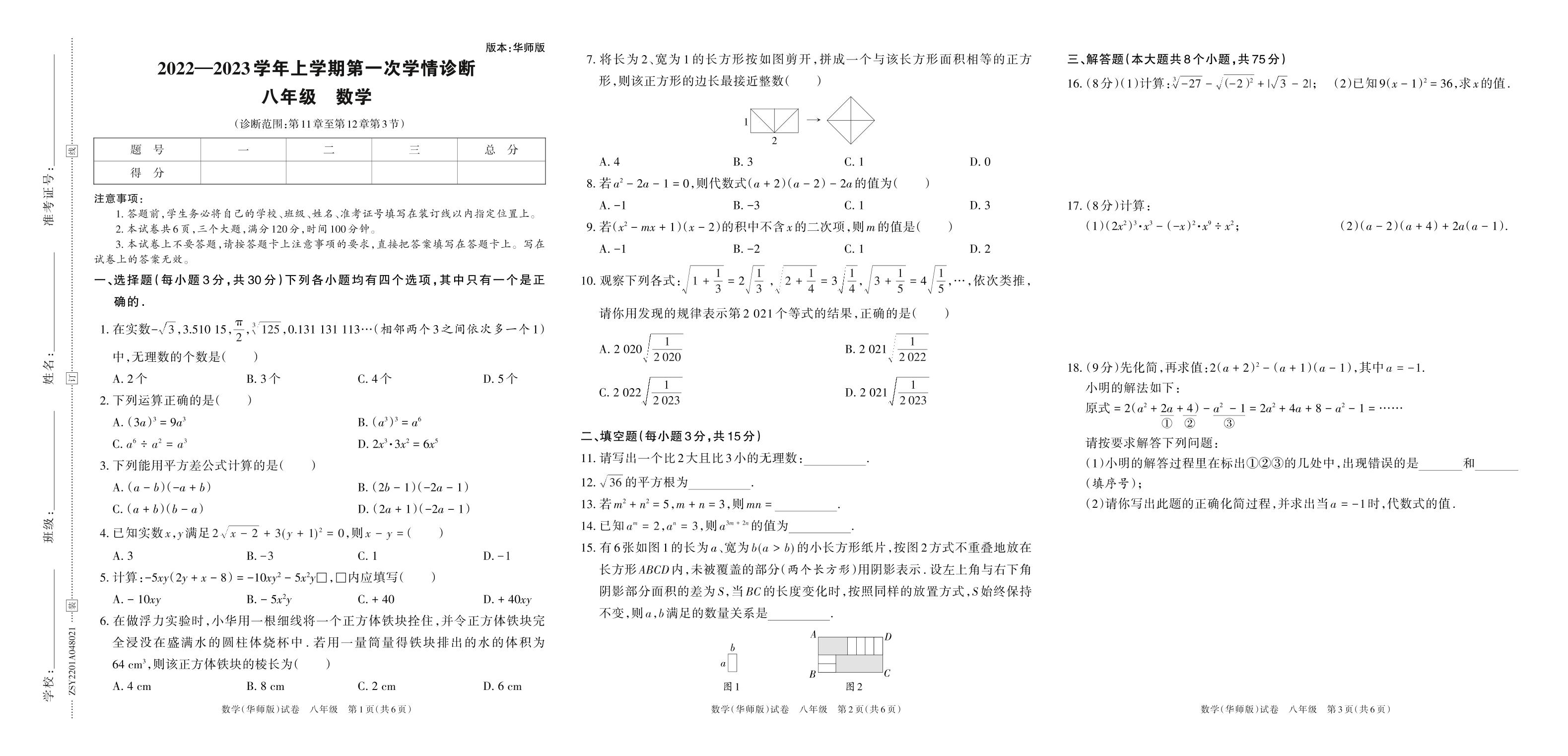 河南省洛阳市孟津区白鹤镇初级中学2022-2023学年上学期第一次学情诊断卷八年级数学(华师版)
