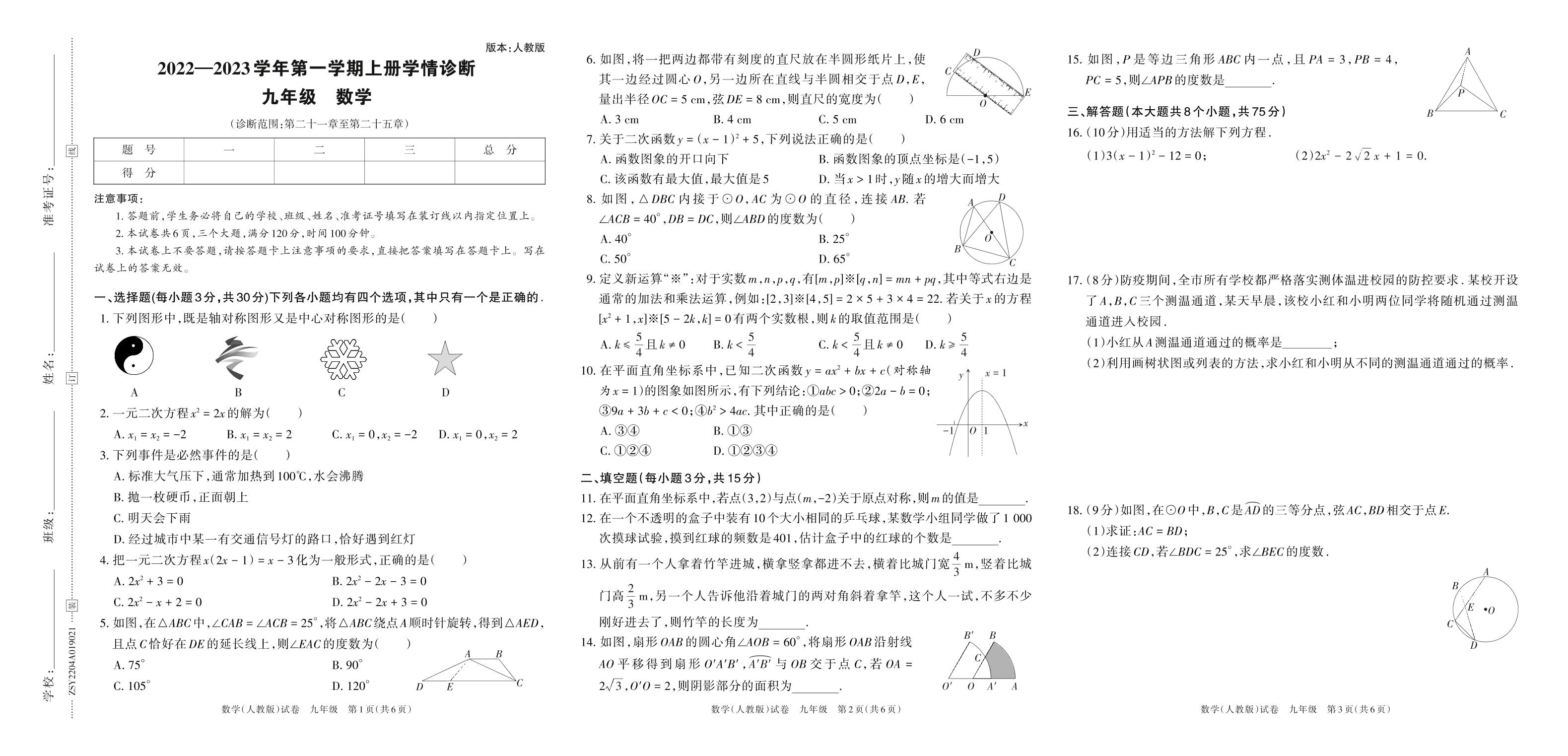 河南省安阳市安阳县2022-2023学年第一学期上册学情诊断卷(期末)九年级数学(人教版)