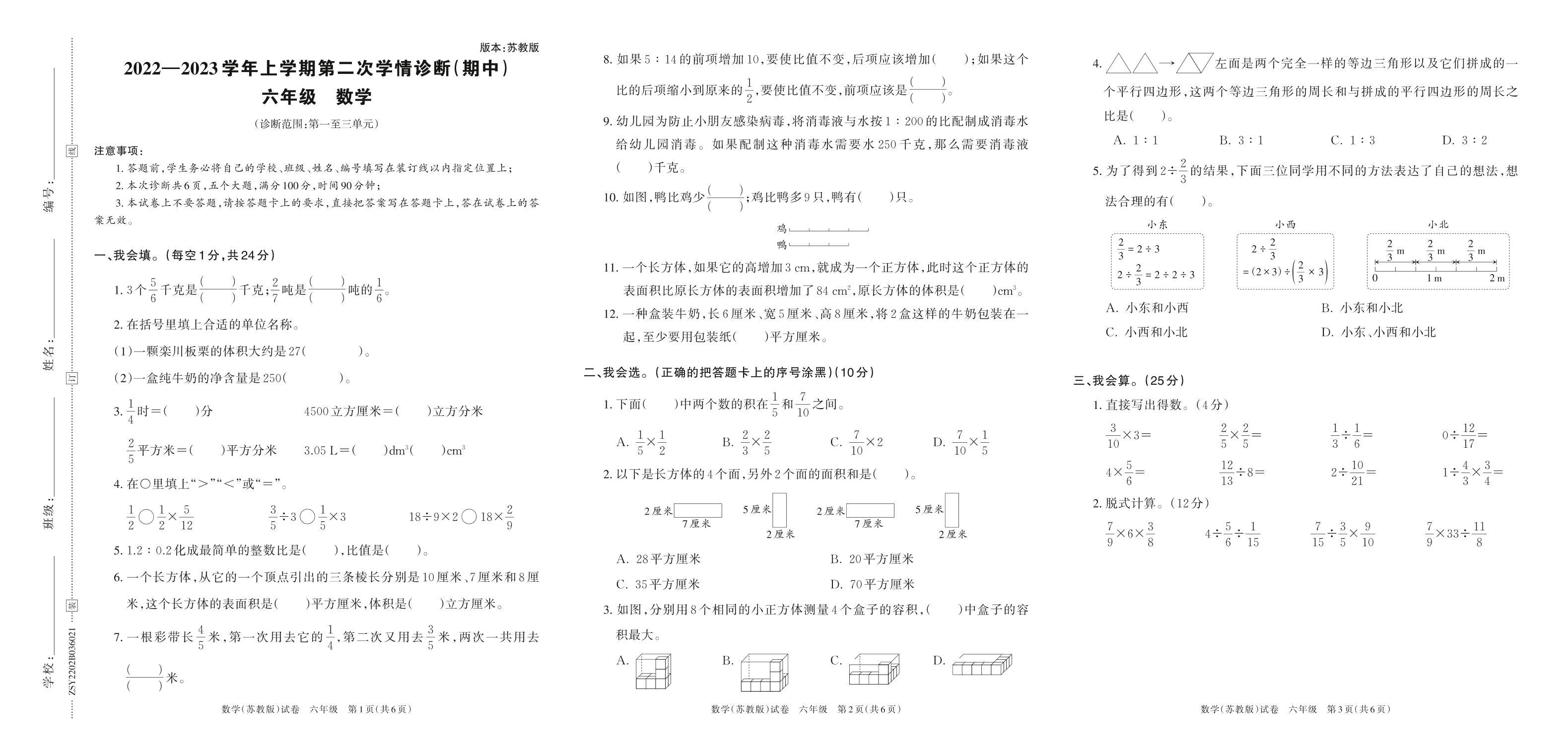 河南省洛阳市栾川县10余所乡镇小学2022-2023学年上学期第二次学情诊断卷(期中)六年级数学(苏教版)