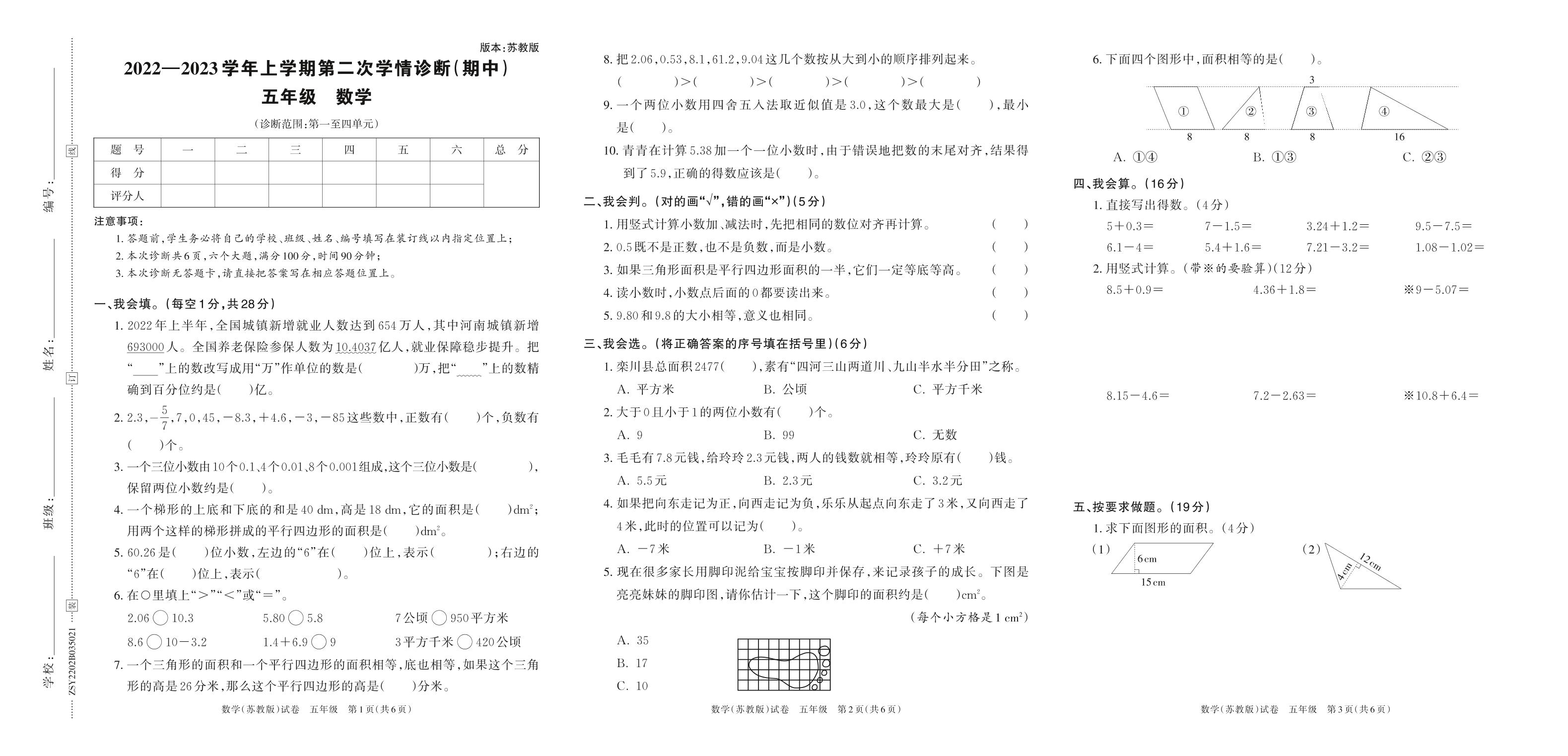 河南省洛阳市栾川县10余所乡镇小学2022-2023学年上学期第二次学情诊断卷(期中)五年级数学(苏教版)