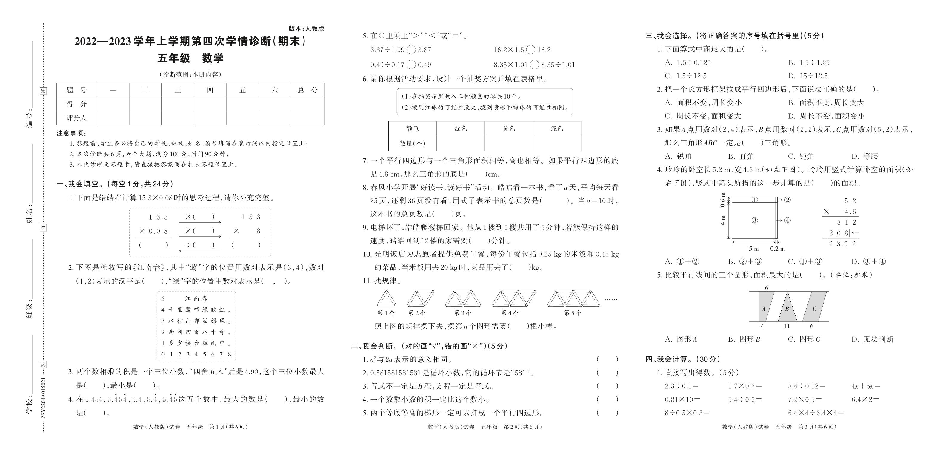 河南省驻马店市确山县第五小学2022-2023学年上学期第二次学情诊断卷(期中)试卷五年级数学(人教版)