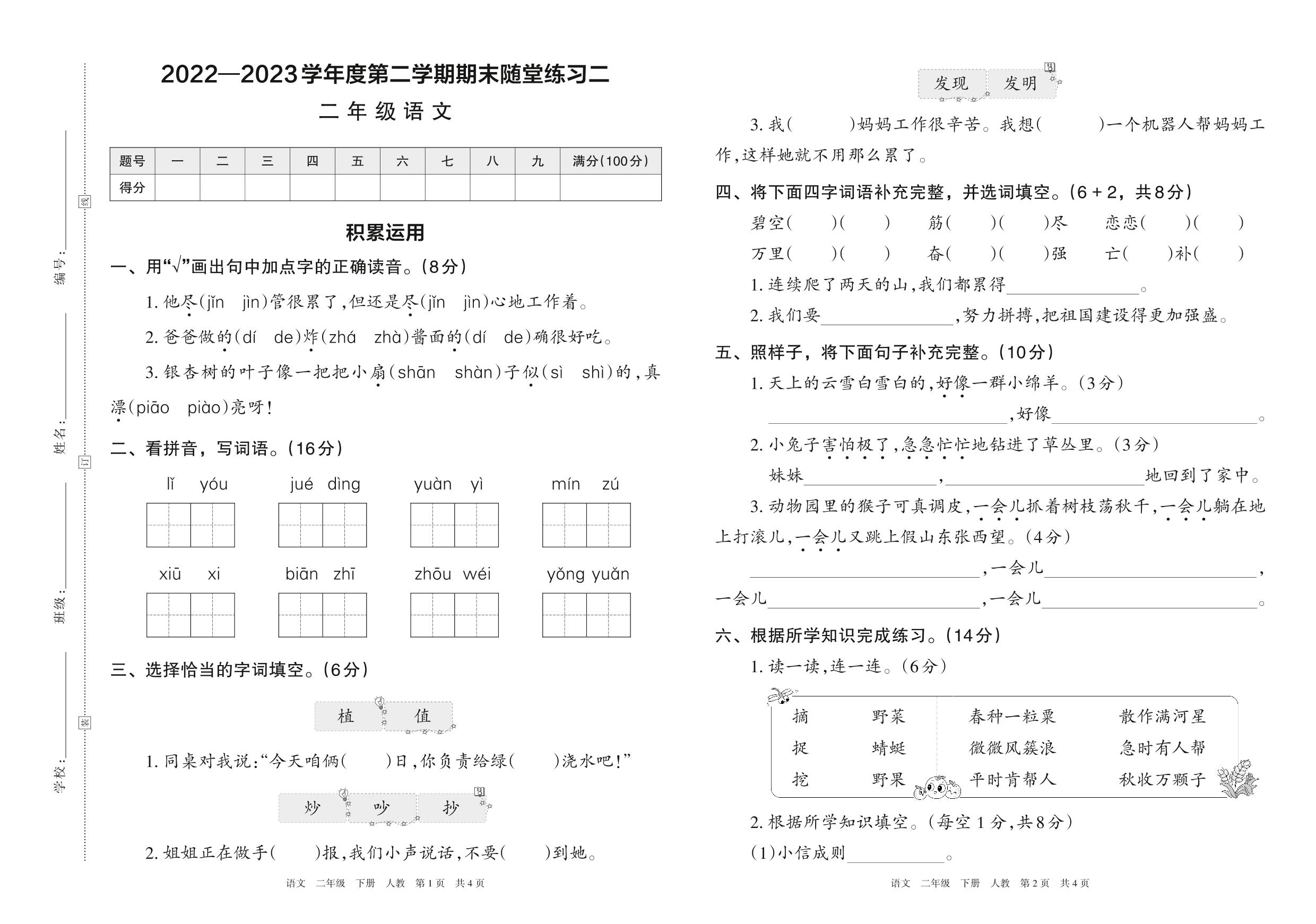 二年级语文人教版下册期末卷