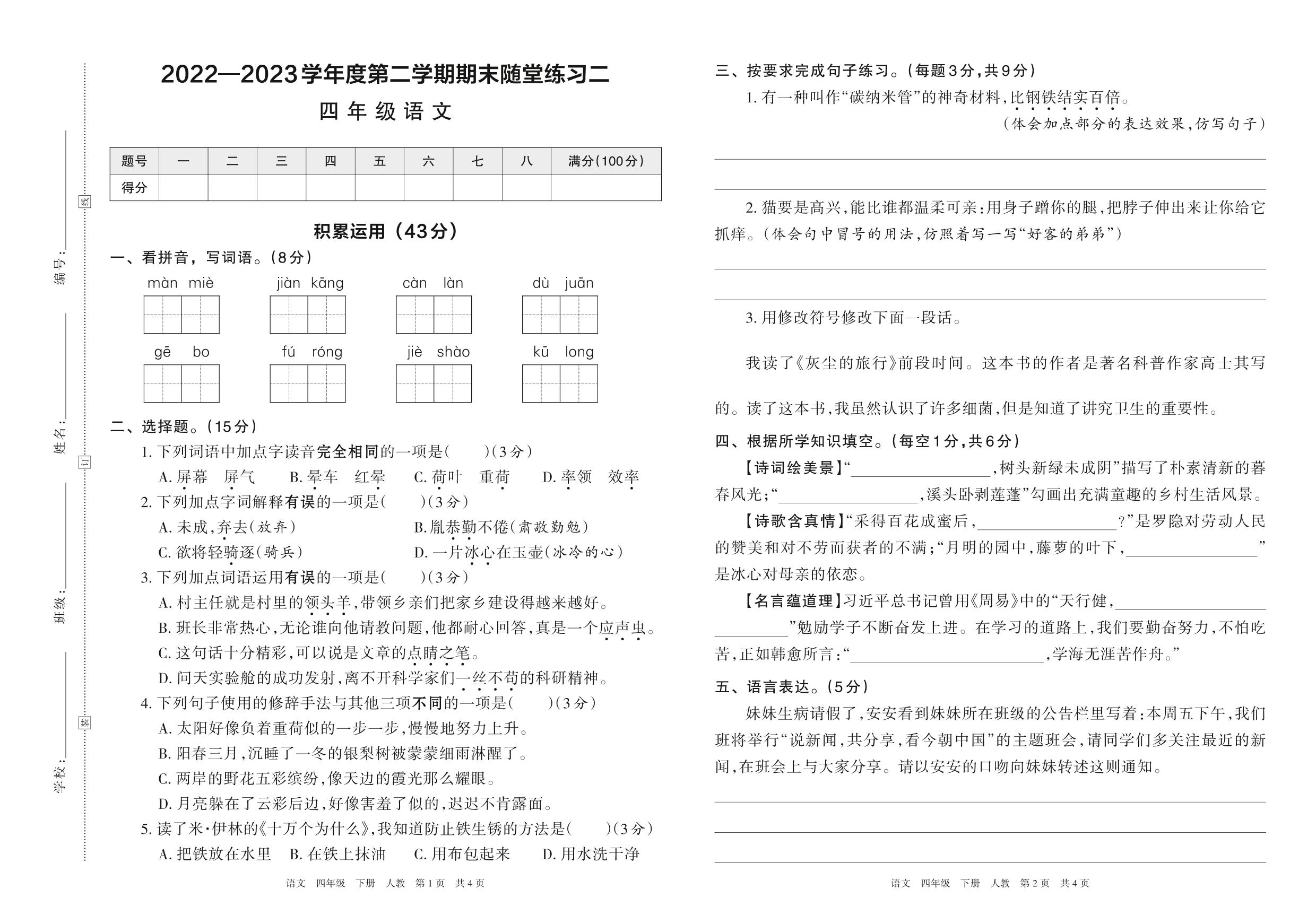安徽省蚌埠市五河县2022—2023学年度第二学期期末随堂练习二四年级语文(人教版)