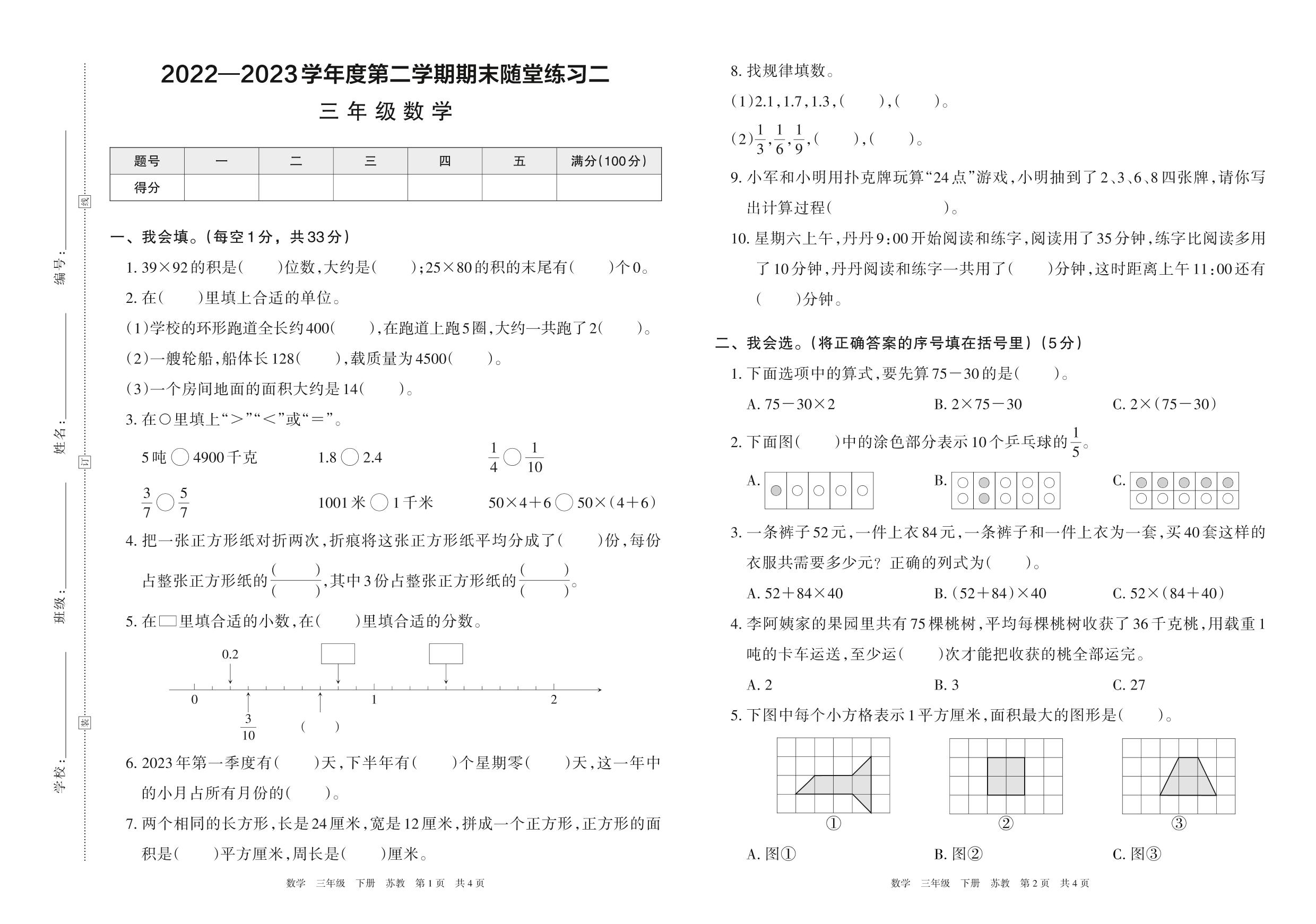 三年级数学苏教版下册期末卷