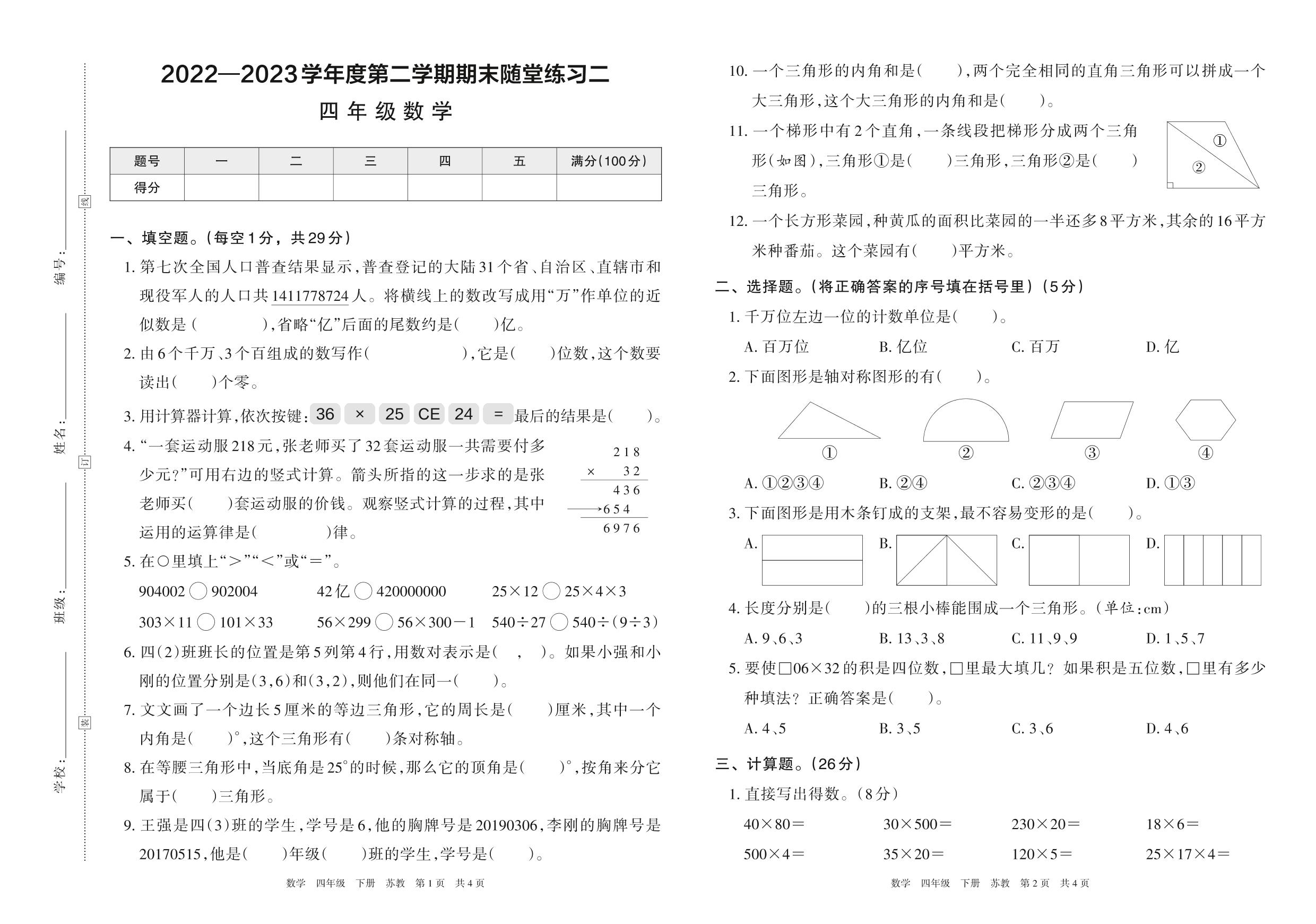 安徽省蚌埠市五河县2022—2023学年度第二学期期末随堂练习二四年级数学(苏教版)