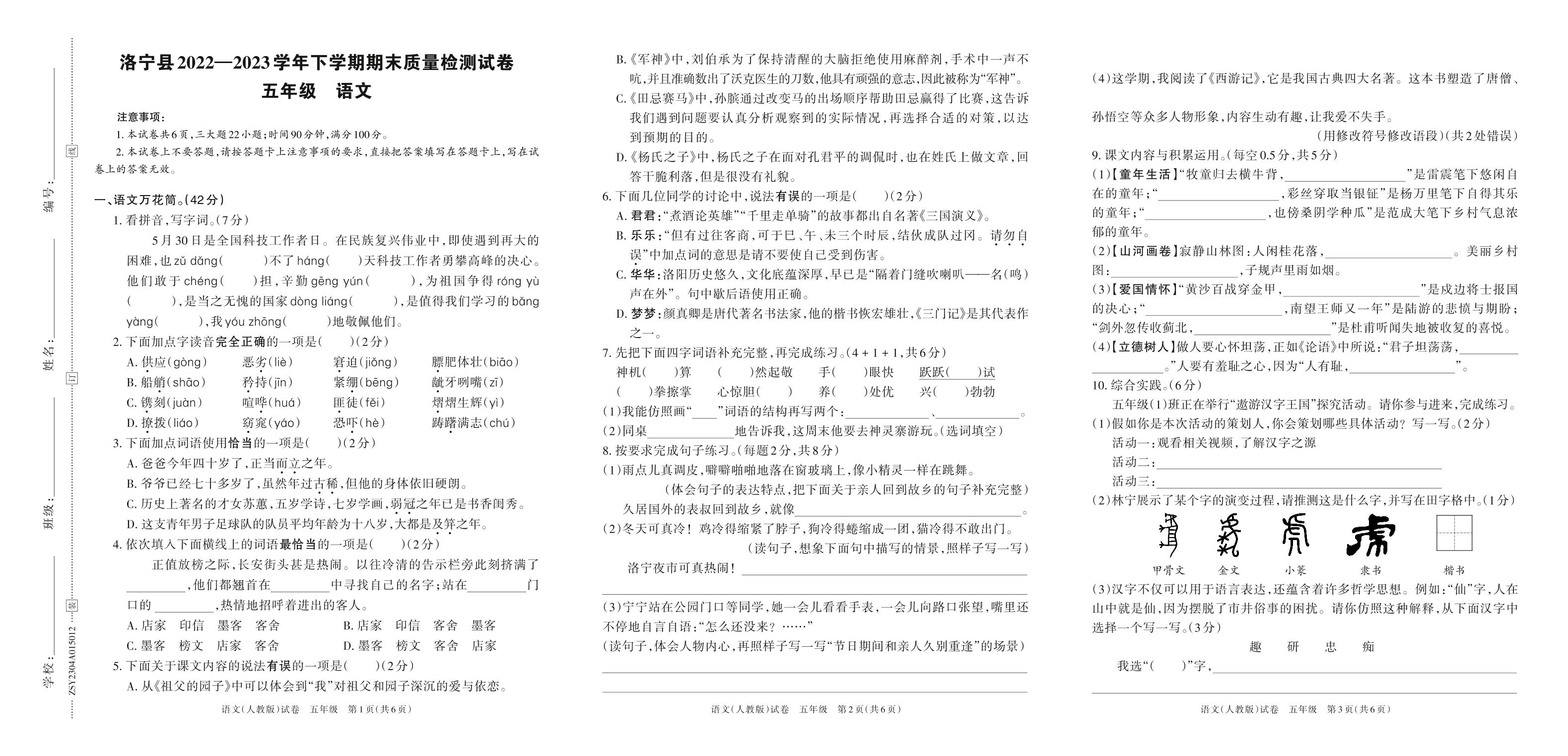 河南省洛阳市洛宁县2022—2023学年下学期期末质量检测试卷五年级语文(人教版)