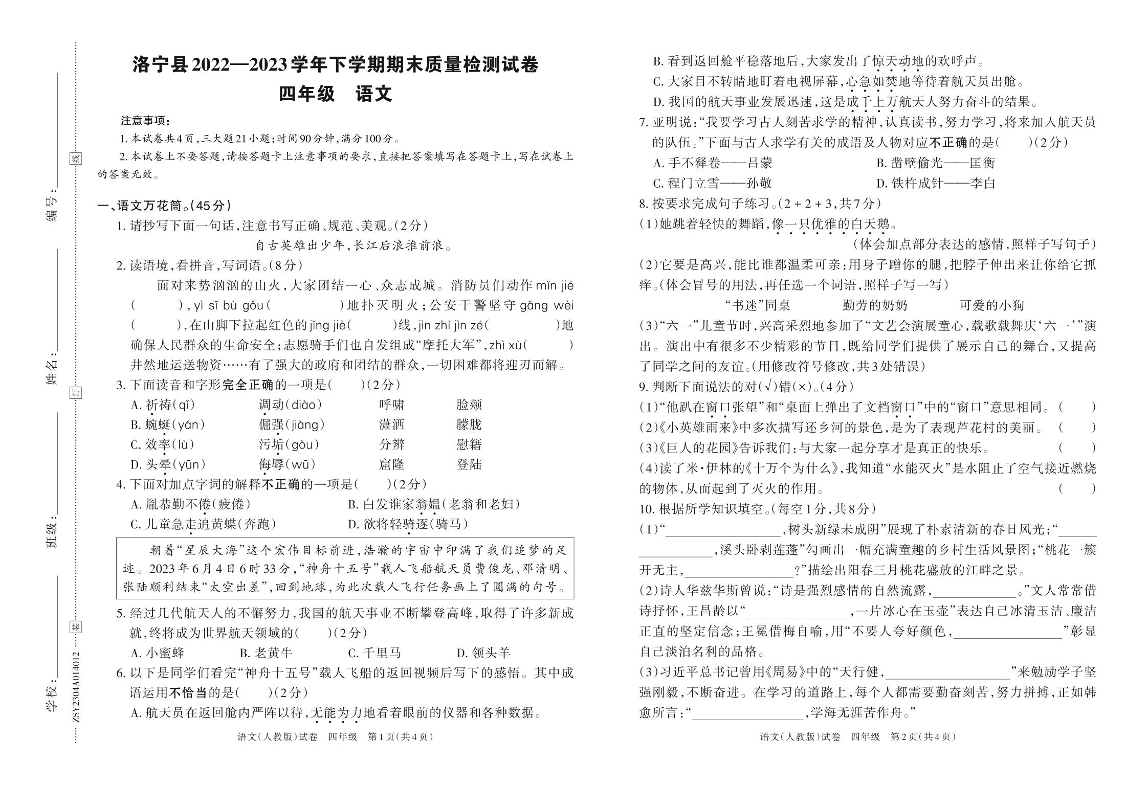河南省洛阳市洛宁县2022—2023学年下学期期末质量检测试卷四年级语文(人教版)