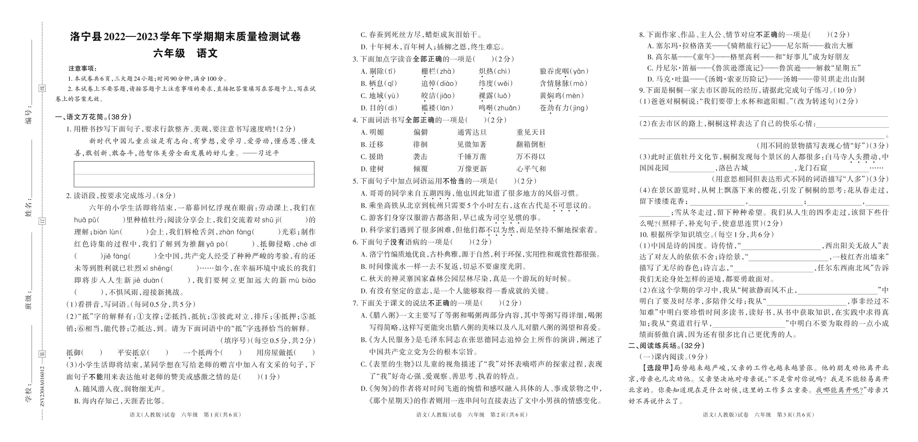 河南省洛阳市洛宁县2022—2023学年下学期期末质量检测试卷六年级语文(人教版)