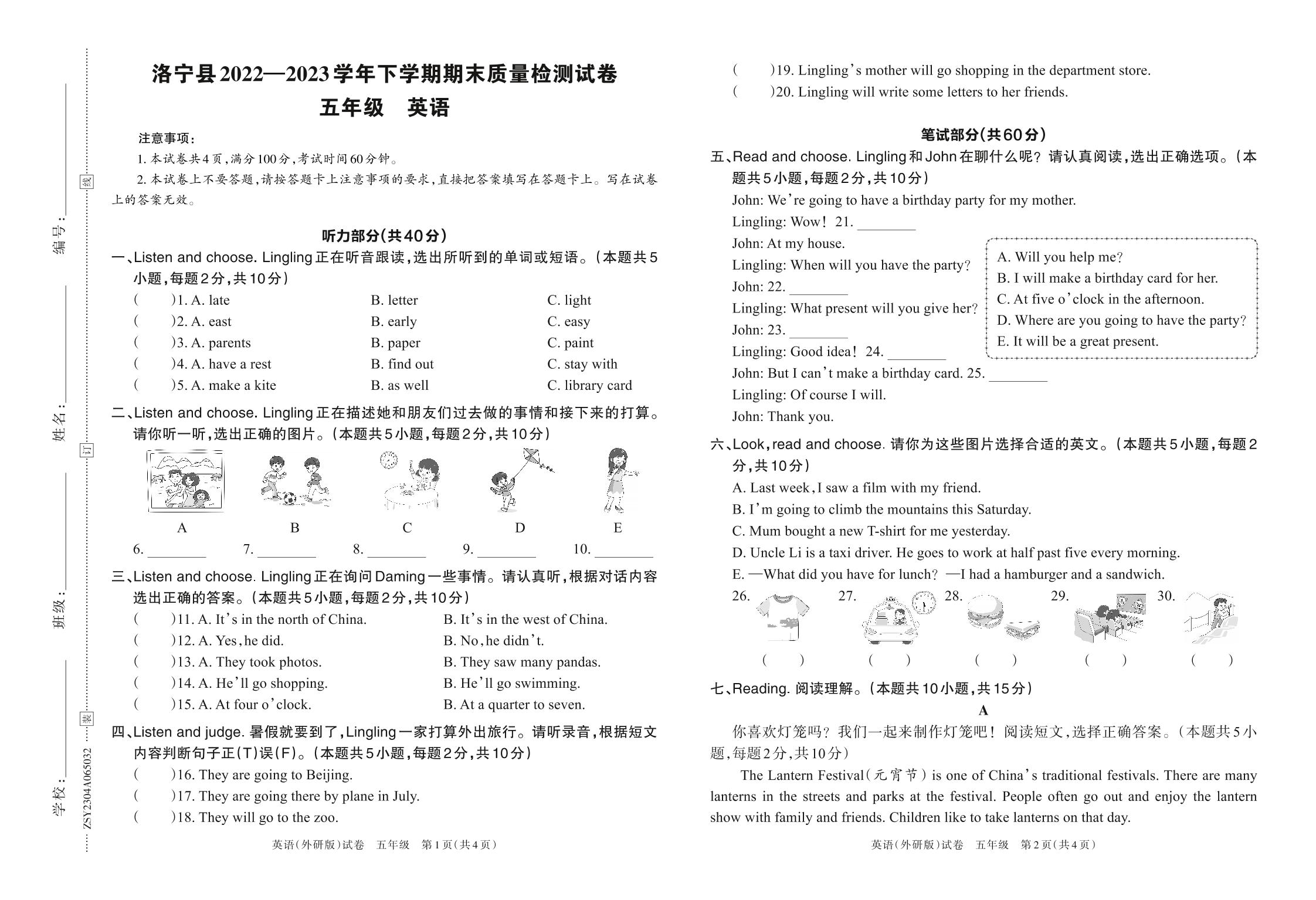 河南省洛阳市洛宁县2022—2023学年下学期期末质量检测试卷五年级英语(外研版)