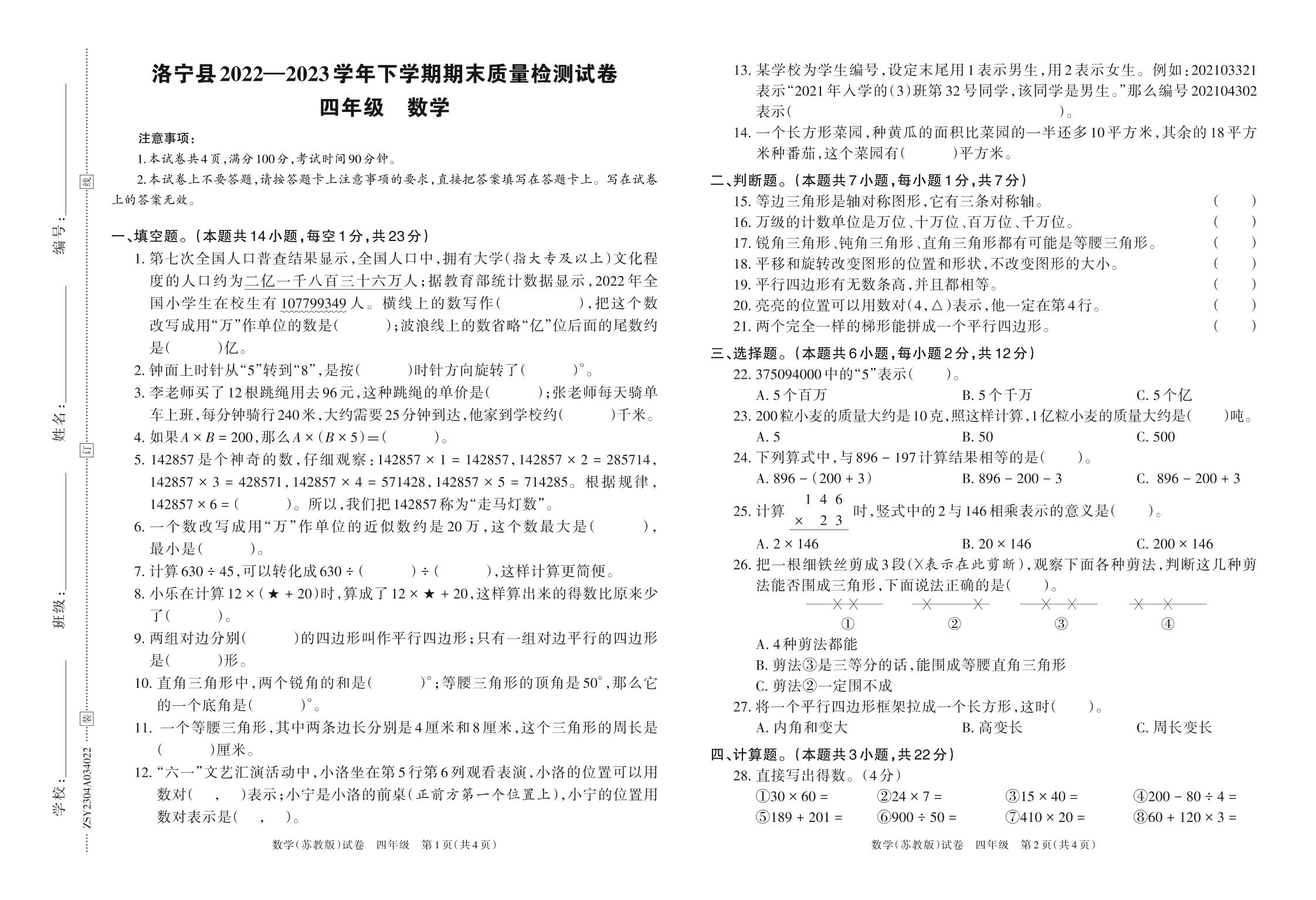 河南省洛阳市洛宁县2022—2023学年下学期期末质量检测试卷四年级数学(苏教版)