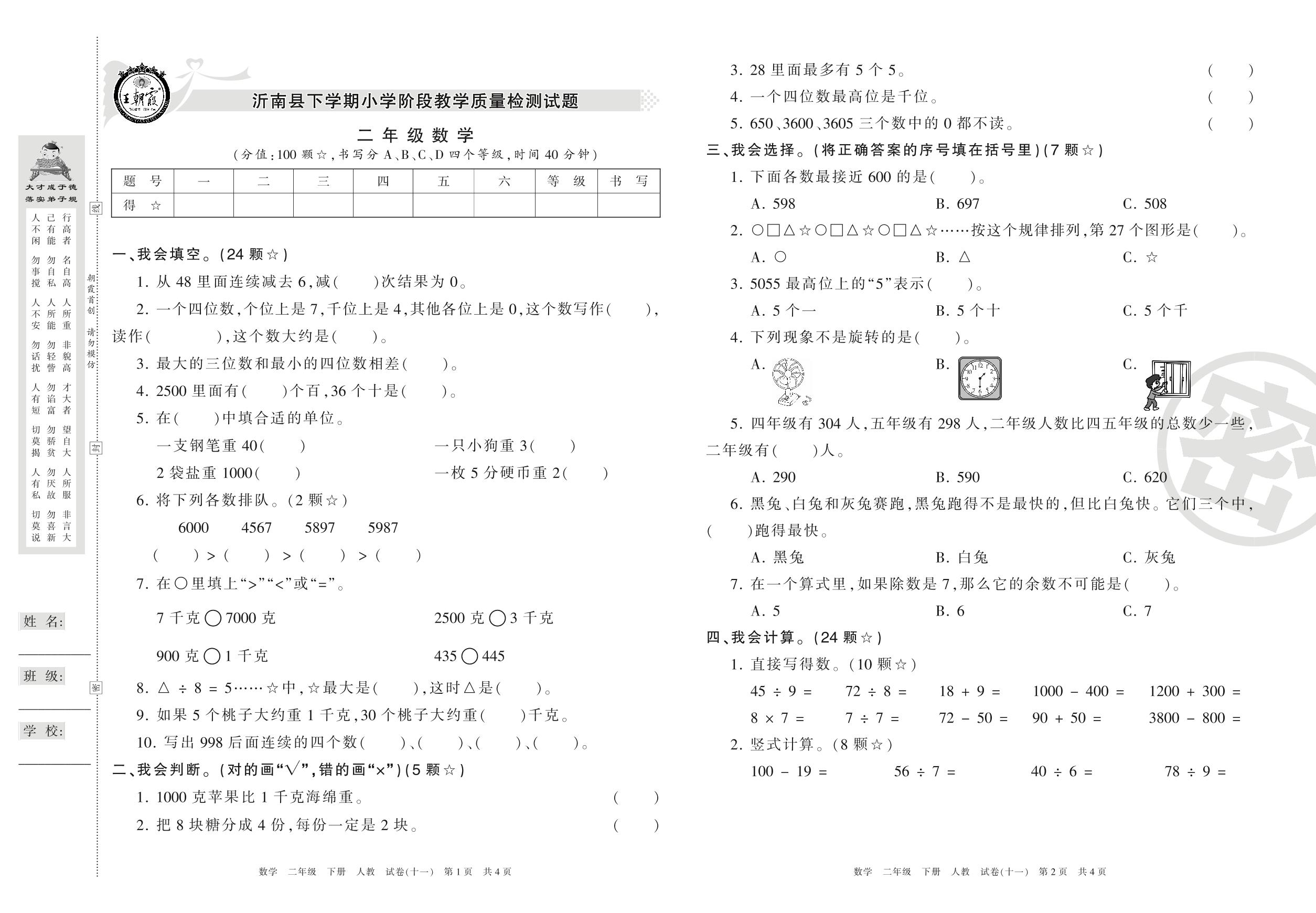 2015-2016学年第二学期临沂市沂南县二年级数学试卷(人教版)【11】