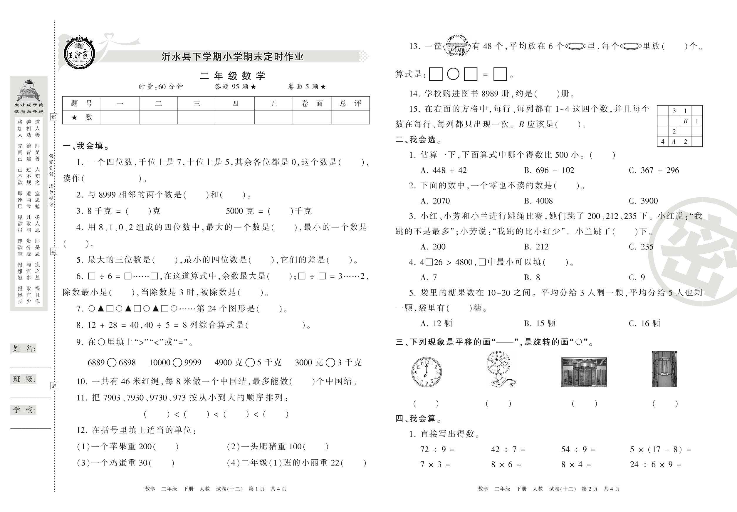 2015-2016学年第二学期临沂市沂水县二年级数学试卷(人教版)【12】