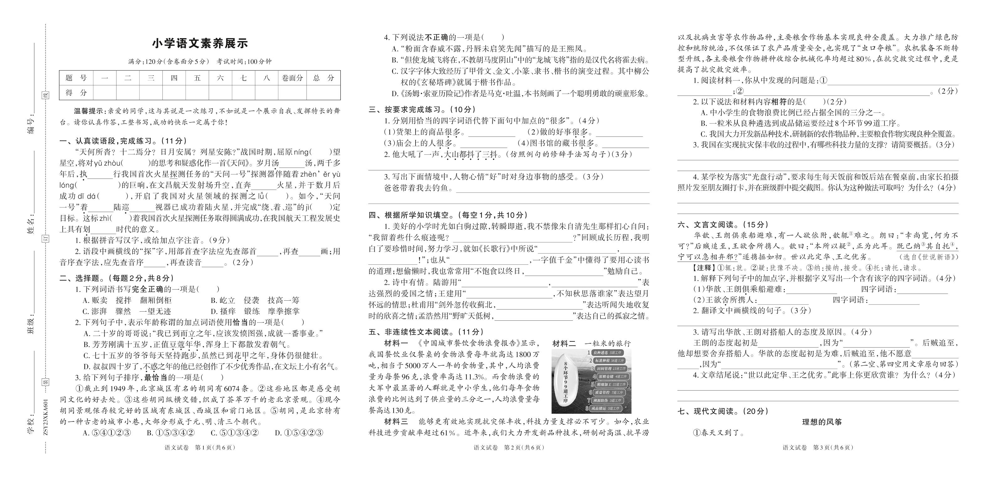 河南省焦作市孟州市2023春小升初试卷六年级语文(人教版)